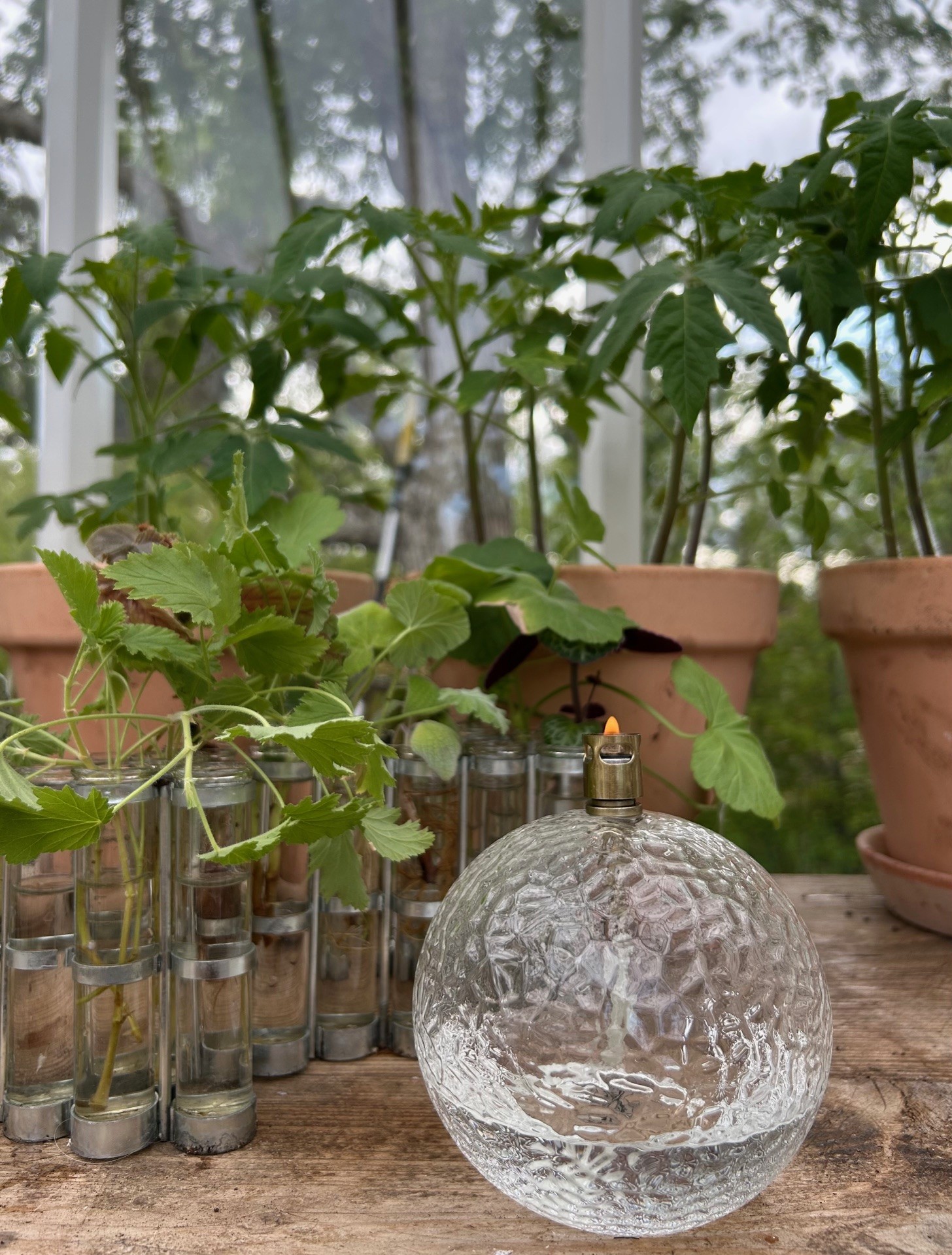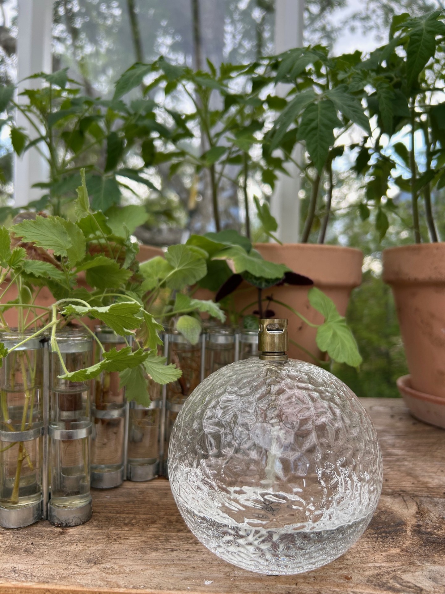 Rund oljelampa i transparent hammrat glas med mässing brännare.