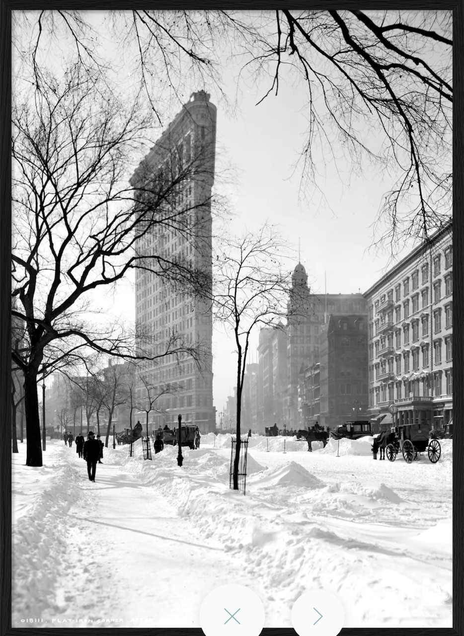 Flatiron Building i hörnet av Broadway och Fifth Avenue. Fotograferad efter snöstorm med hästkärror på gatan.
