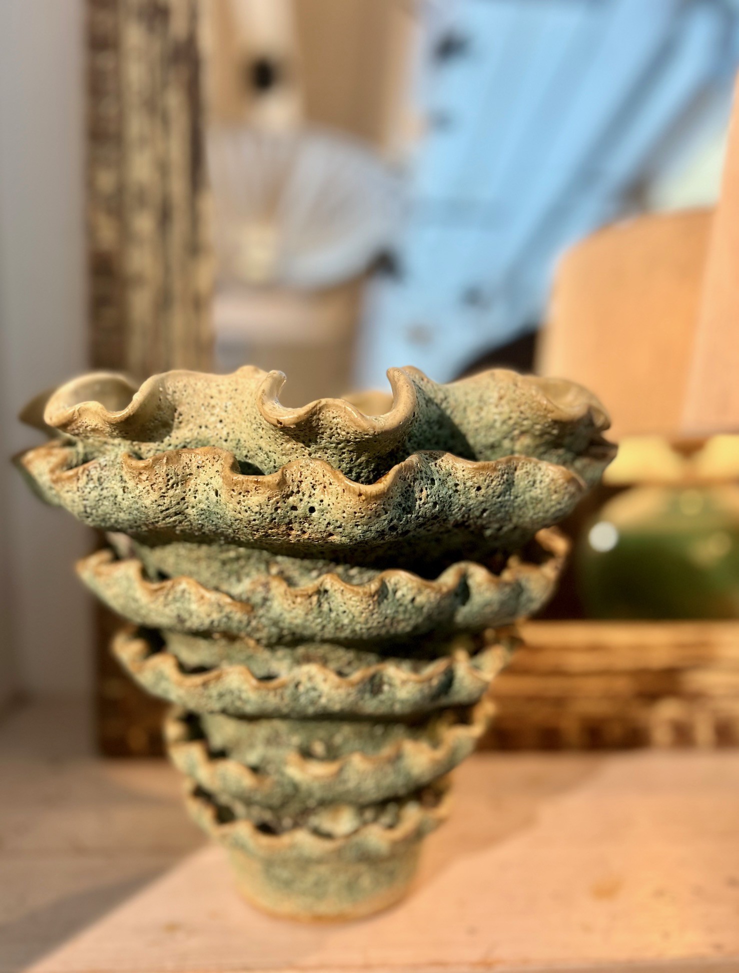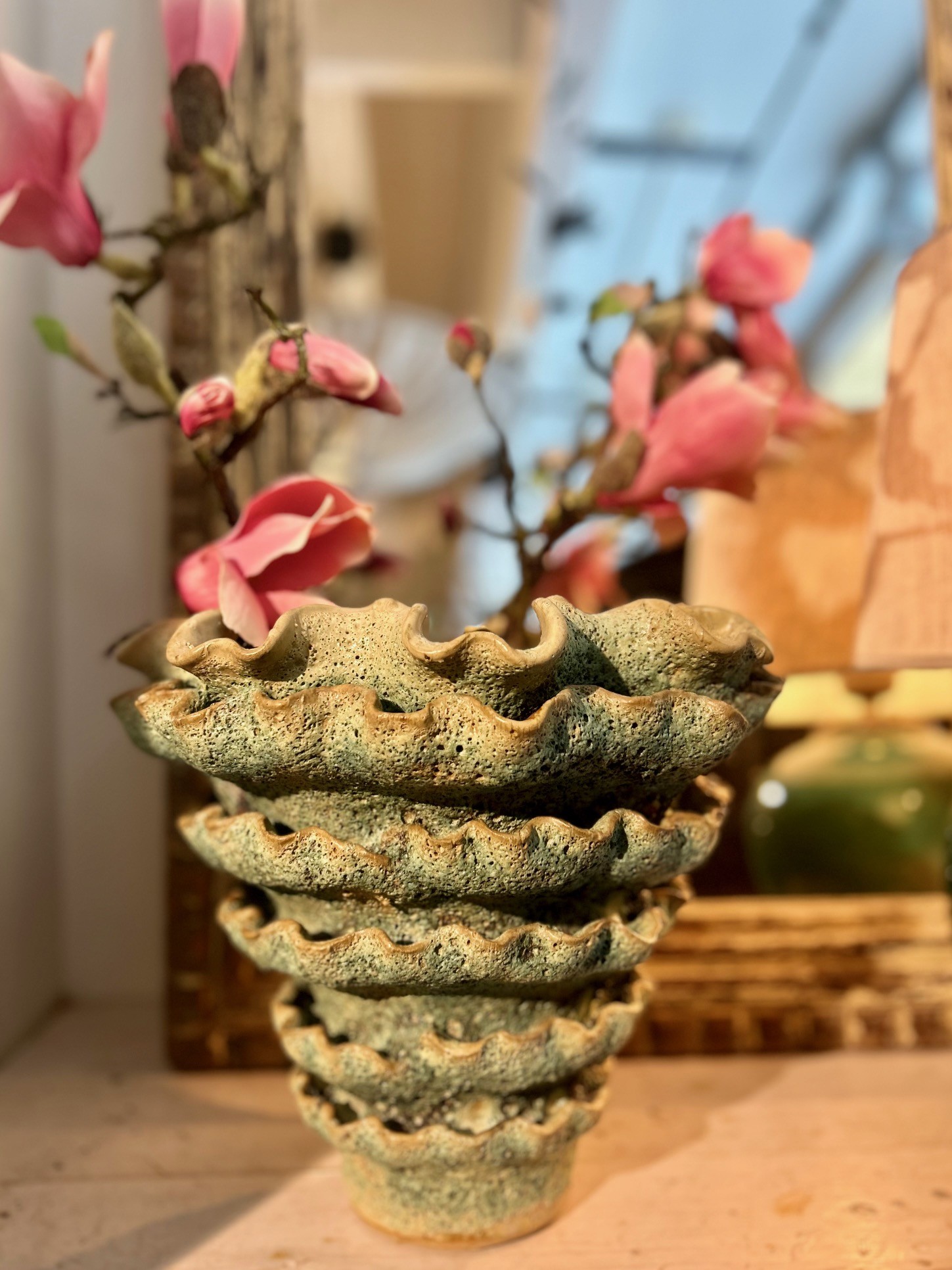 En fantastisk vas i glaserad keramik som är fin som den är. Varje vas är handgjord och därmed är ingen exakt likadan. För att inte förstöra insidan på vasen rekommenderar vi att ställa färska blommor i ett vattenglas eller i en avklippt PET flaska som sparar insidan samt behöver du inte diska hela vasen vid byte av vatten.