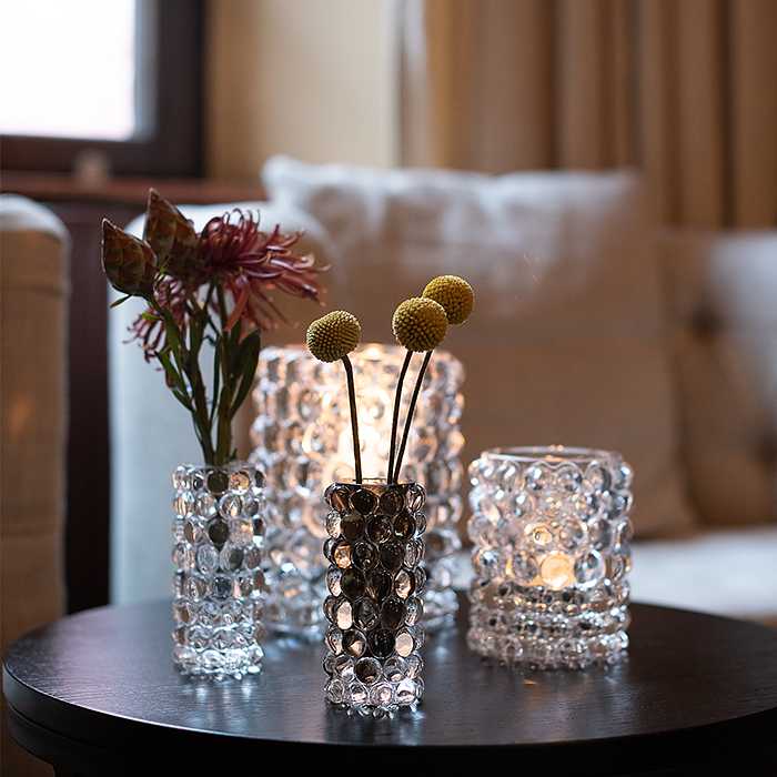 Hurricane Boule Mini är den perfekta lilla vasen som passar på alla dukningar med en eller två blommor i. Vasen ca 11,5 cm hög och 4,5 cm i diameter. Vikt ca 370-450 gr. Varje Hurricane Boule Mini är unik, så avvikelser på +/- 3% är en del hantverket och charmen i designen. Bubblorna tillkommer när man blåser glasmassan i en gjutjärnsform och formas sedan för hand. Ytan är fylld med optiska bubblor som gör att Hurricane Boule Mini får ett skimrande ljus i stilmässigt släktskap med 1970 talets glasdesign. Hurricane Boule Mini tål ej maskindisk.