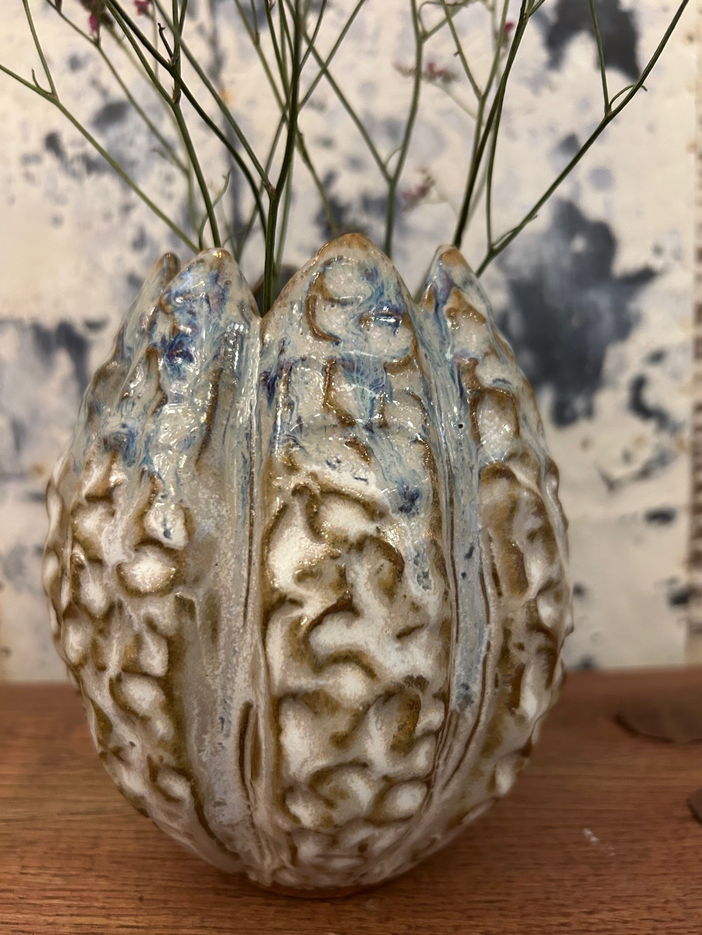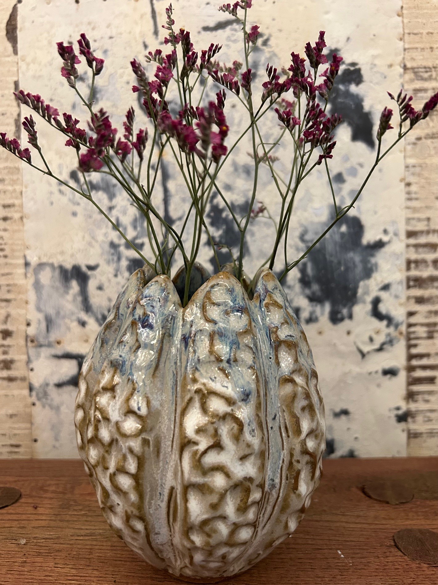 Vacker keramikvas, likt en frökapsel, i sober färgskala. Vasen är fin som den är eller med torkade blommor som på bilden. Den tål vatten, men som alla keramikvaser kan fukt bildas i botten och vaksamhet rekommenderas beroende vilket underlag vasen står på. Man kan med fördel använda en insats/ett litet glas med vatten om man vill ha färska blommor i vasen. Ingen vas är exakt likadan då vasen är handgjord.