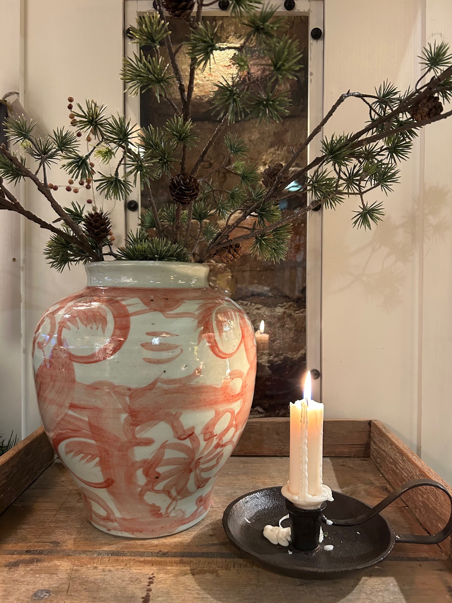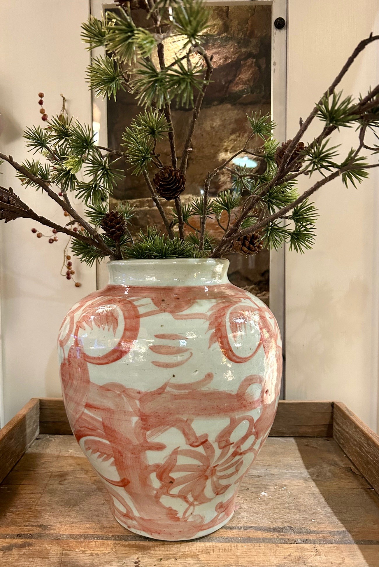 Den klassiska blå/vita vasen vi jobbat med i vårt sortiment i många år har kommit i rött. Handmålad vas/urna i keramik, lika fin till jul som till sommaren. Då produkten är handgjord ser ingen exakt lika ut, vilket gör att den kan skilja sig från den som är fotad.