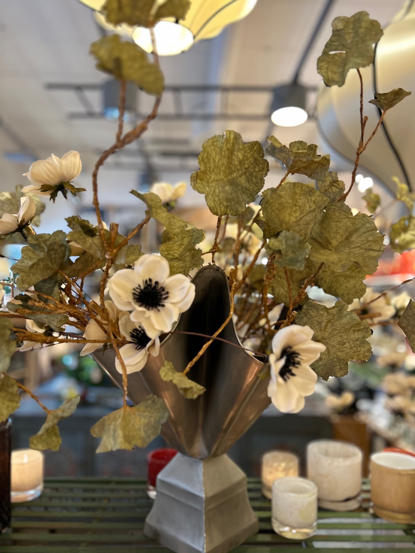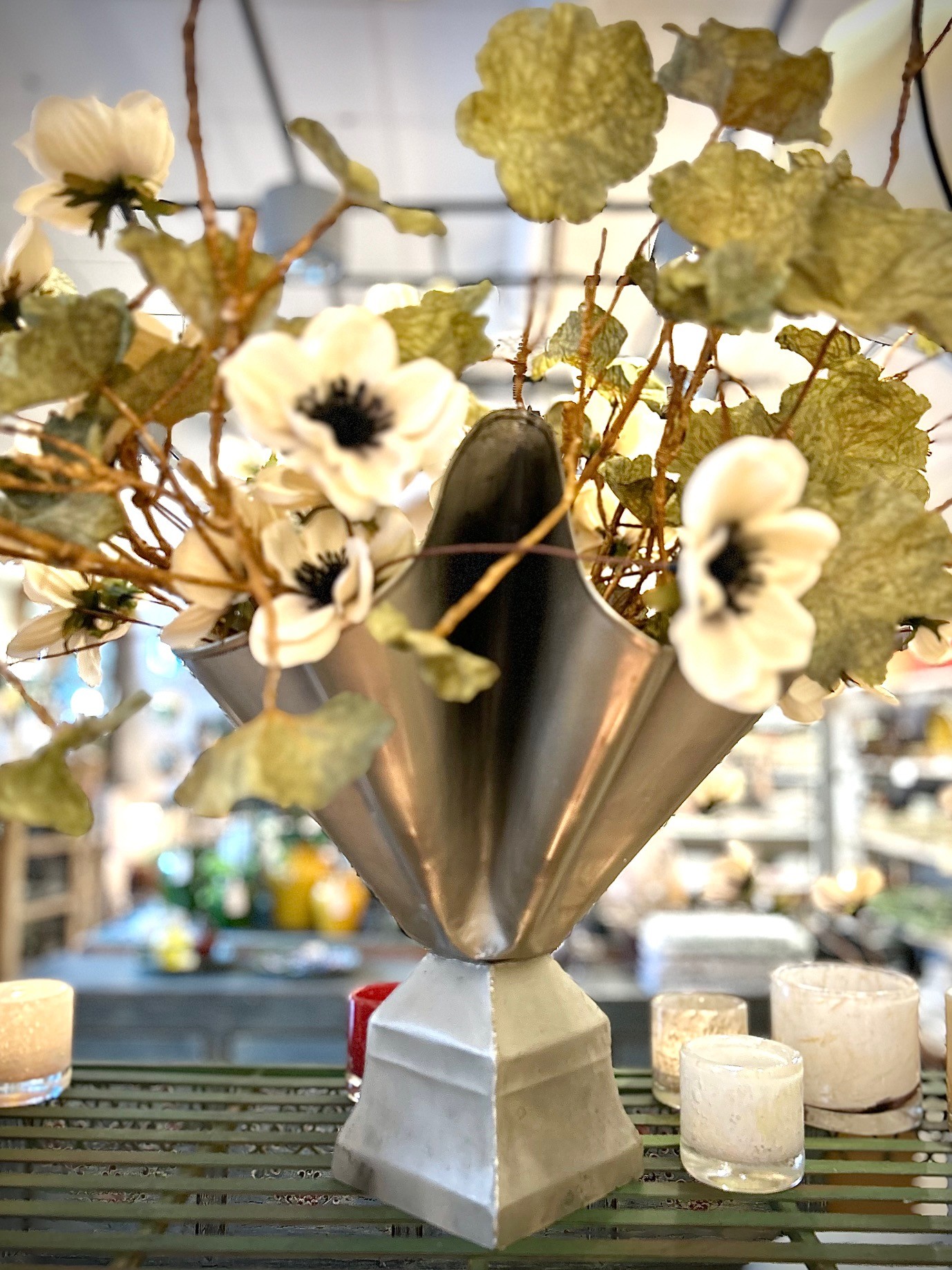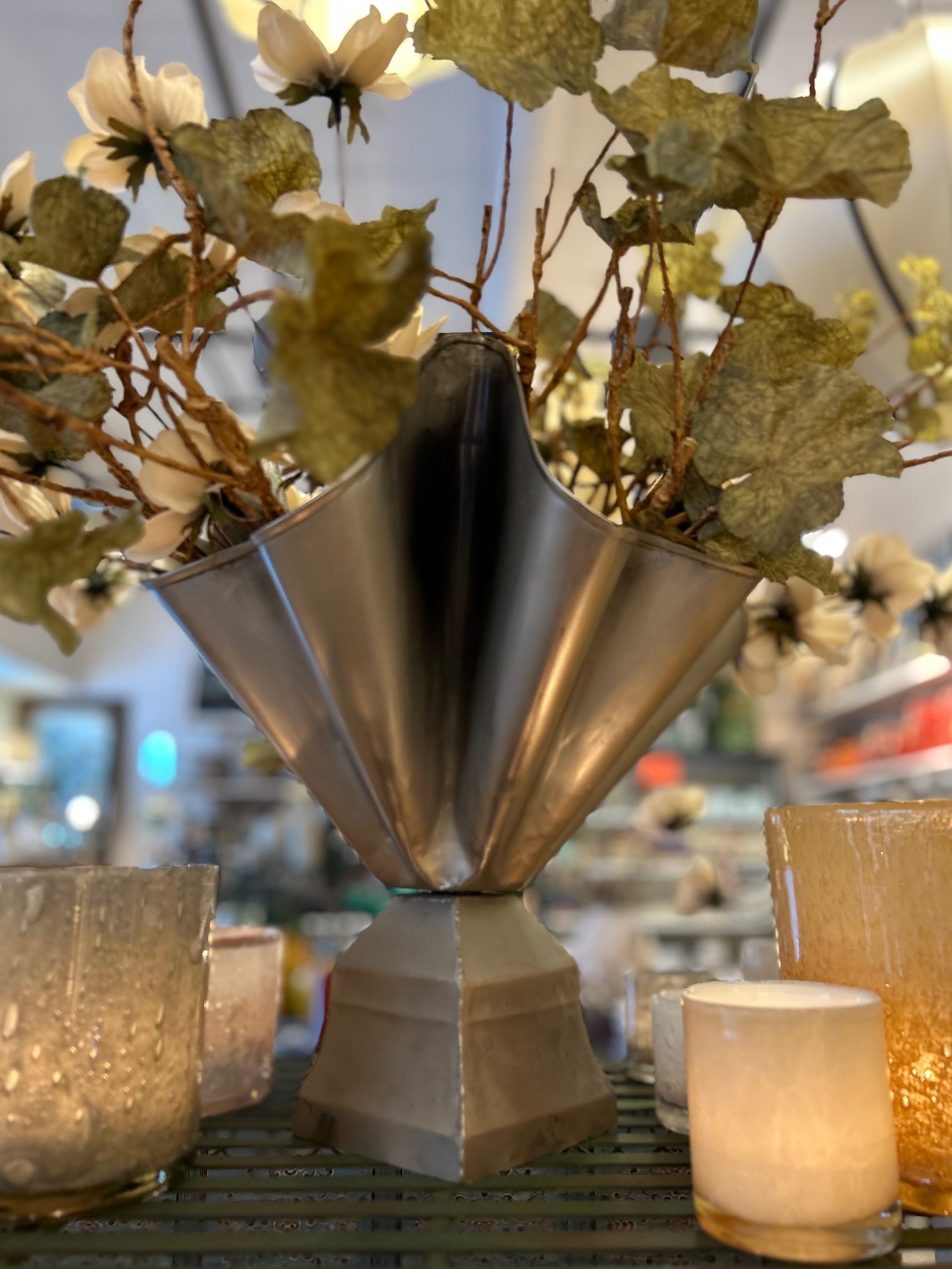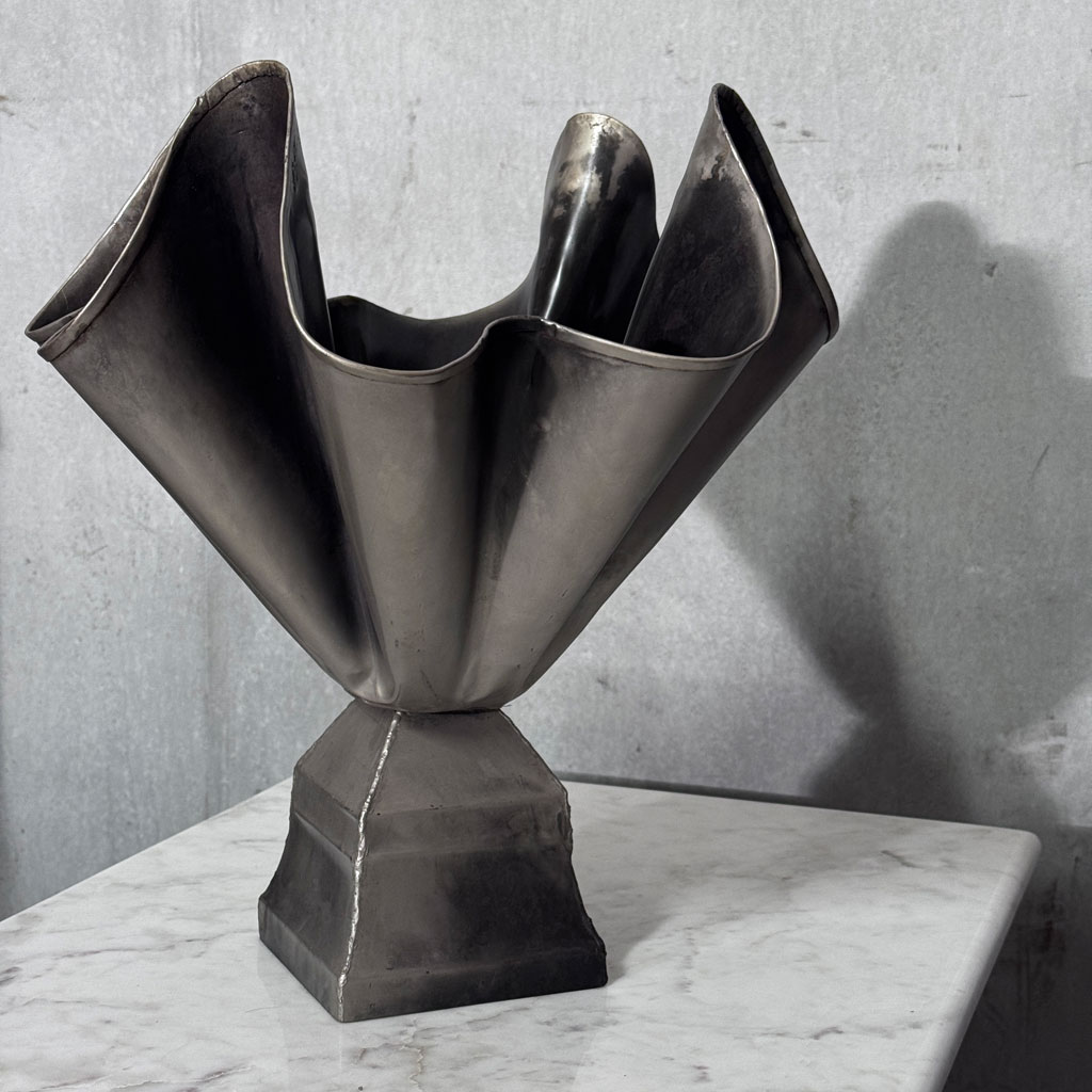 Fantastisk pampig vas i tenn finish (metall), om du vill ha konstgjorda blommor i vasen går det bra att vika skaften för att få till ett snyggt uttryck. För färska blommor rekommenderar vi att använda en blomsterfakir i botten för att få till ett tjusigt arrangemang