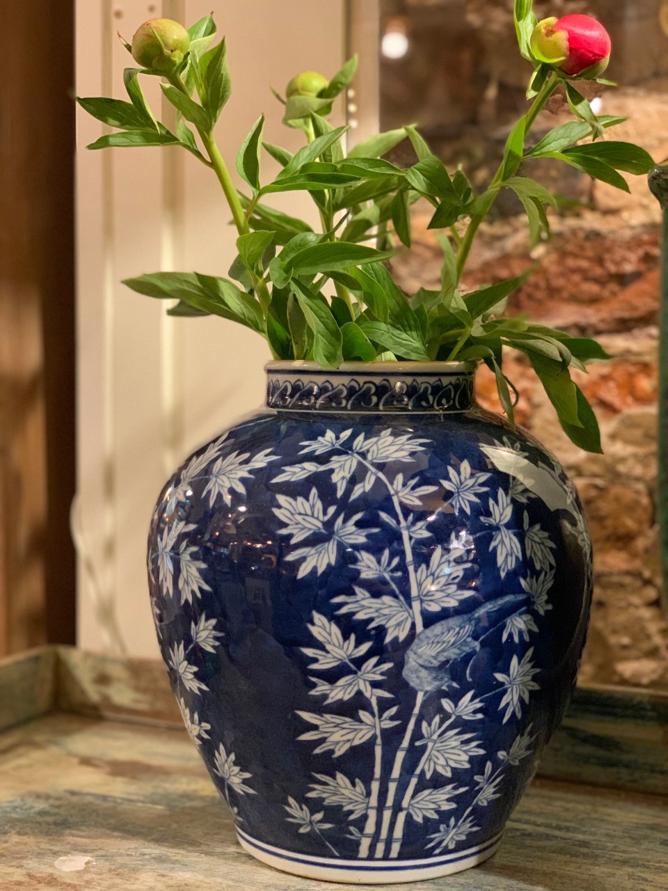 Handgjord blå vas med vackert mönster i vitt.