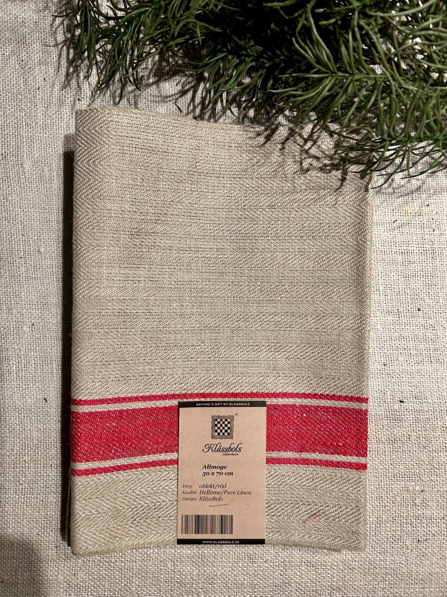 Allmogemönster har rötter i det svenska bondesamhället och hela världens hantverkstradition. Vi hittar idag spår ända ifrån 1700-talet och vi kan uppleva allmoge i olika varianter men mest känt är kurbitsmålningar. Klässbols allmogemönster är enkel och genuin och med en tydlig framtoning. Linnehandduken är vävd i Klässbols väveri i Värmland av 100 % lin. Har man väl börjat använda linneprodukter över lag så byter man helst inte ut dem. Sköter ni den på rätt sätt så kan ni njuta av den i många många år. Faktum är att det är svårt att hitta någon annan textil än linne som har så hög kvalité, är såpass slitstark, miljövänlig och upplevs vackrare desto mer tiden går. Därför passar Klässbols linneprodukter till såväl fest som till vardag.