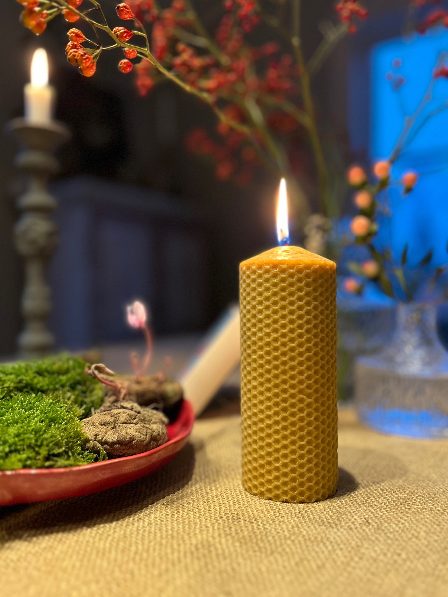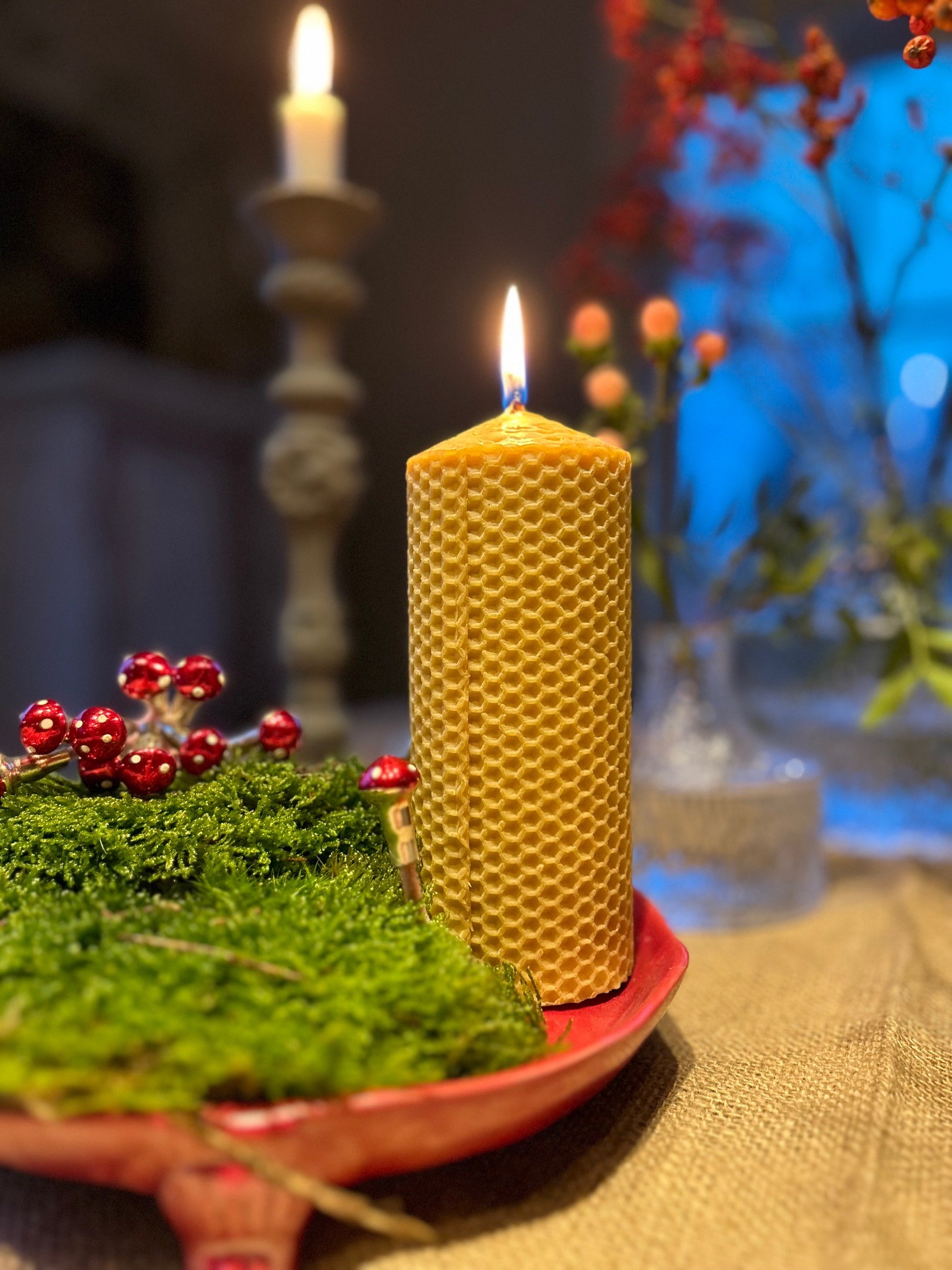 Bivaxljus med 100% jungfruvax från spanska Cerabella. Ett bivaxljus brinner väldigt lugnt och stilla med en svag doft av honung, ett extra vackert ljus i juletid eller en fin present till någon som älskar ljus.