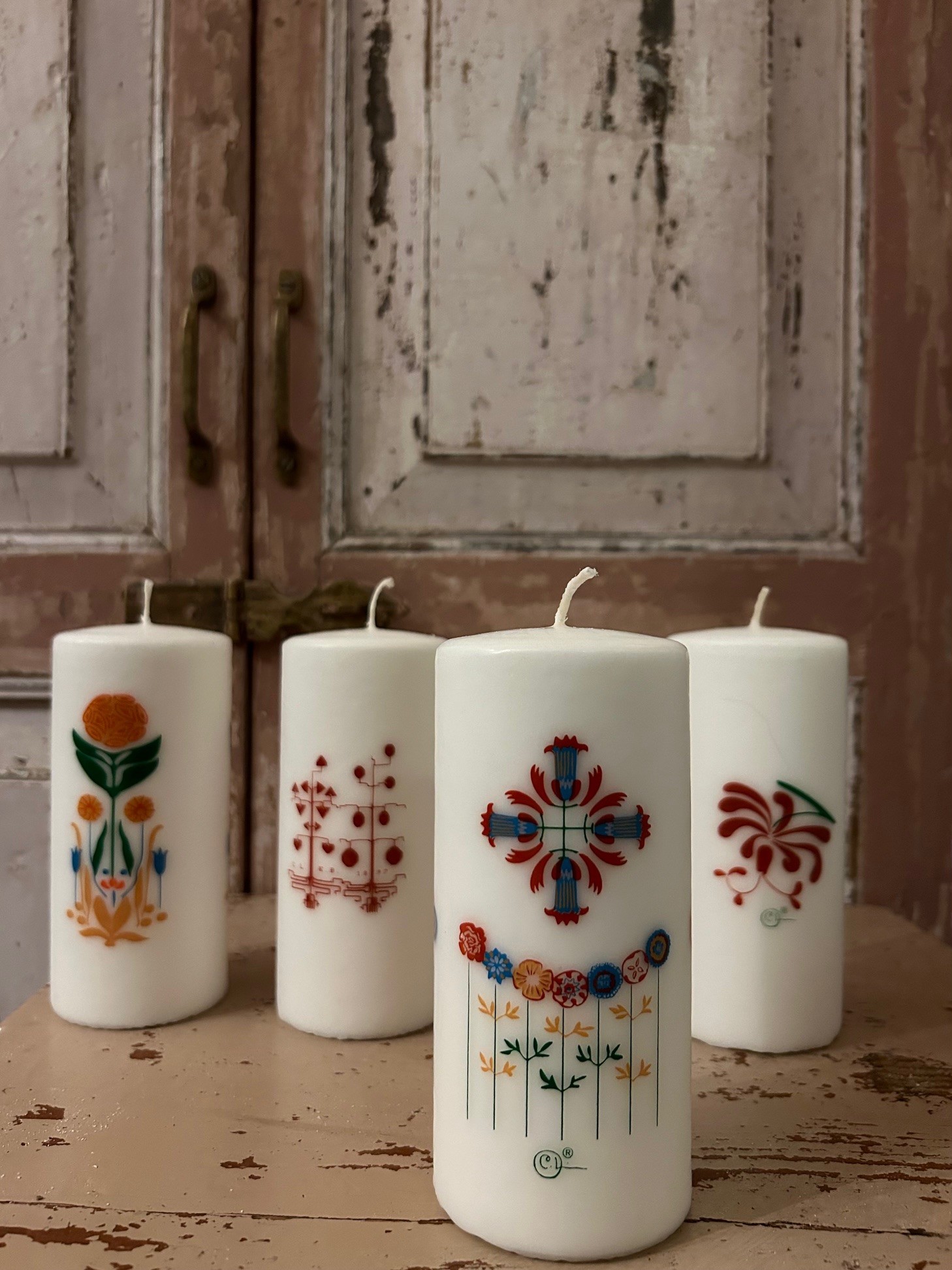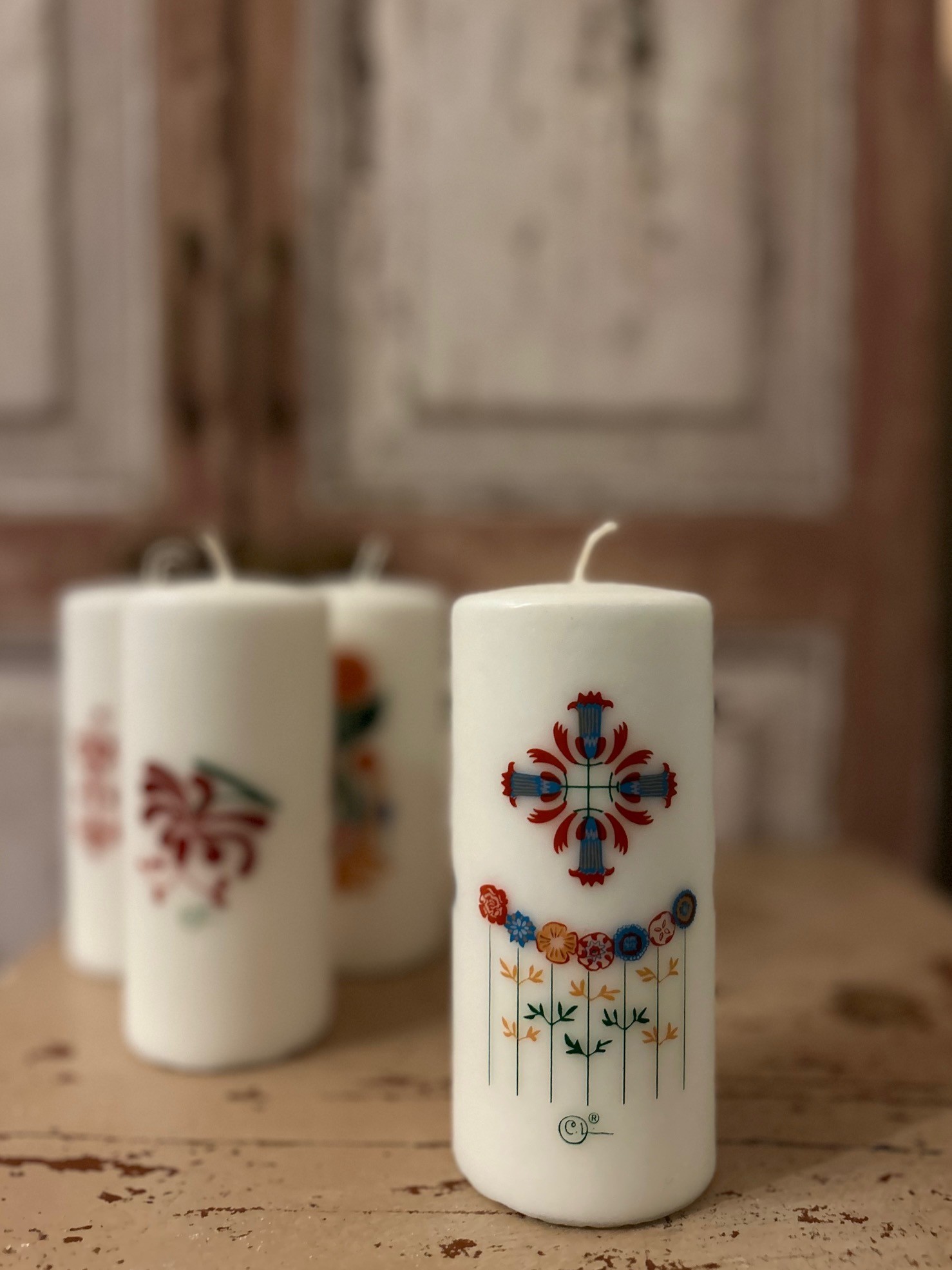 Vitt blockljus med mönster Blomranka är från Karin Larssons broderade kudde. Genuint hantverk av kvalitets-ljus möter en kulturskatt med fokus på Karin Larssons kulörer och design. 100% Svanen-märkt stearin ger lång och fin brinntid med klar låga. Brinntid ca 50h.