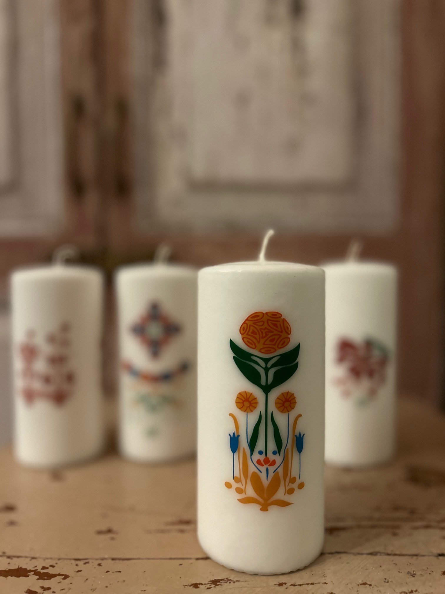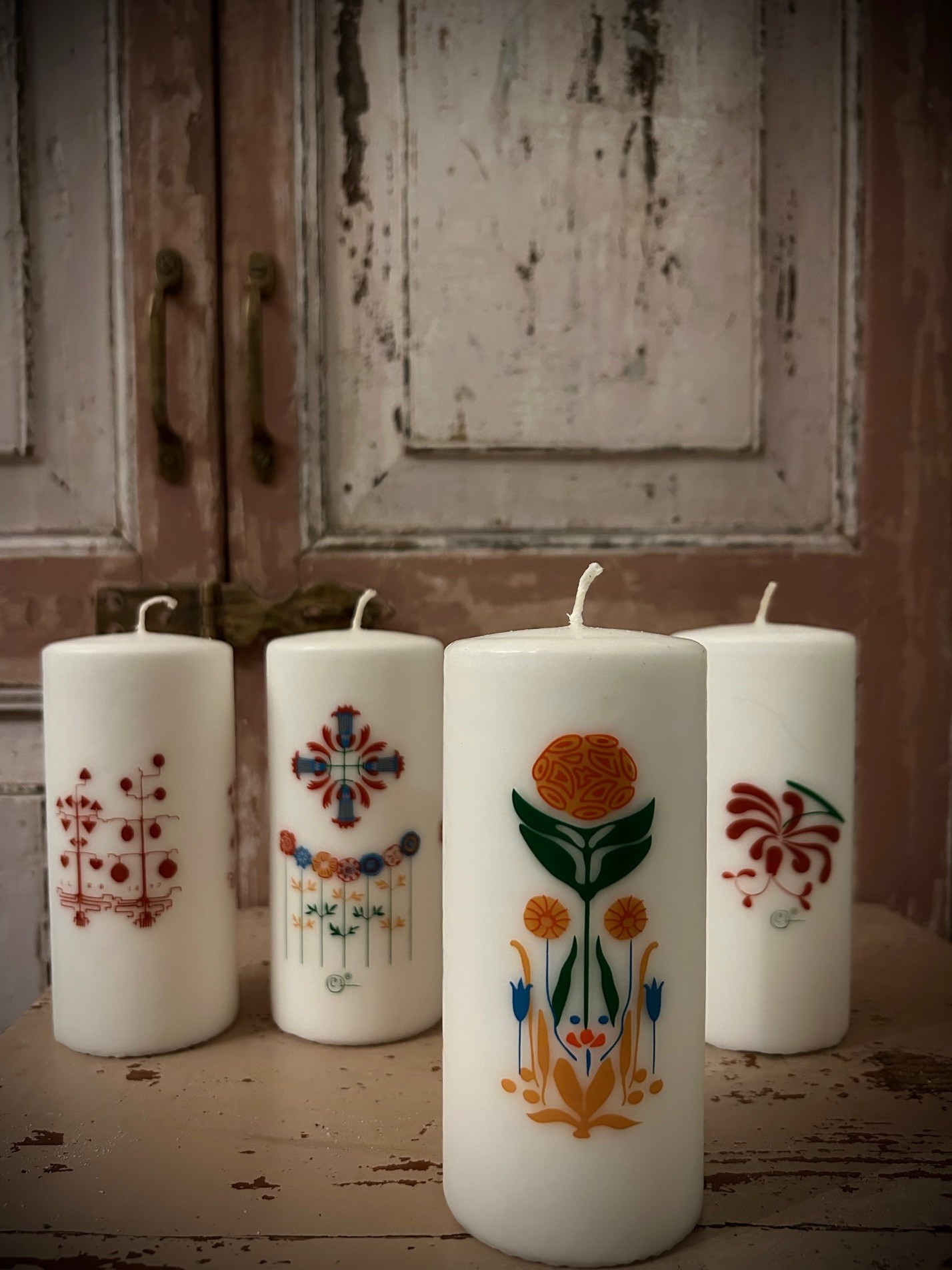 Detta mönster återkommer även på alla askar på Sundborn Gården. Genuint hantverk av kvalitets-ljus möter en kulturskatt med fokus på Karin Larssons kulörer och design. 100% Svanen-märkt stearin ger lång och fin brinntid med klar låga. Brinntid ca 50h.
