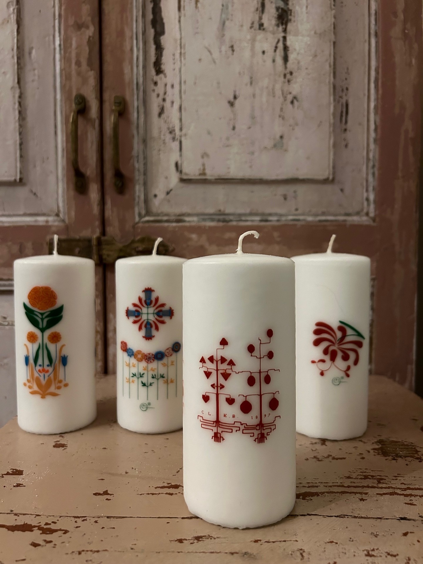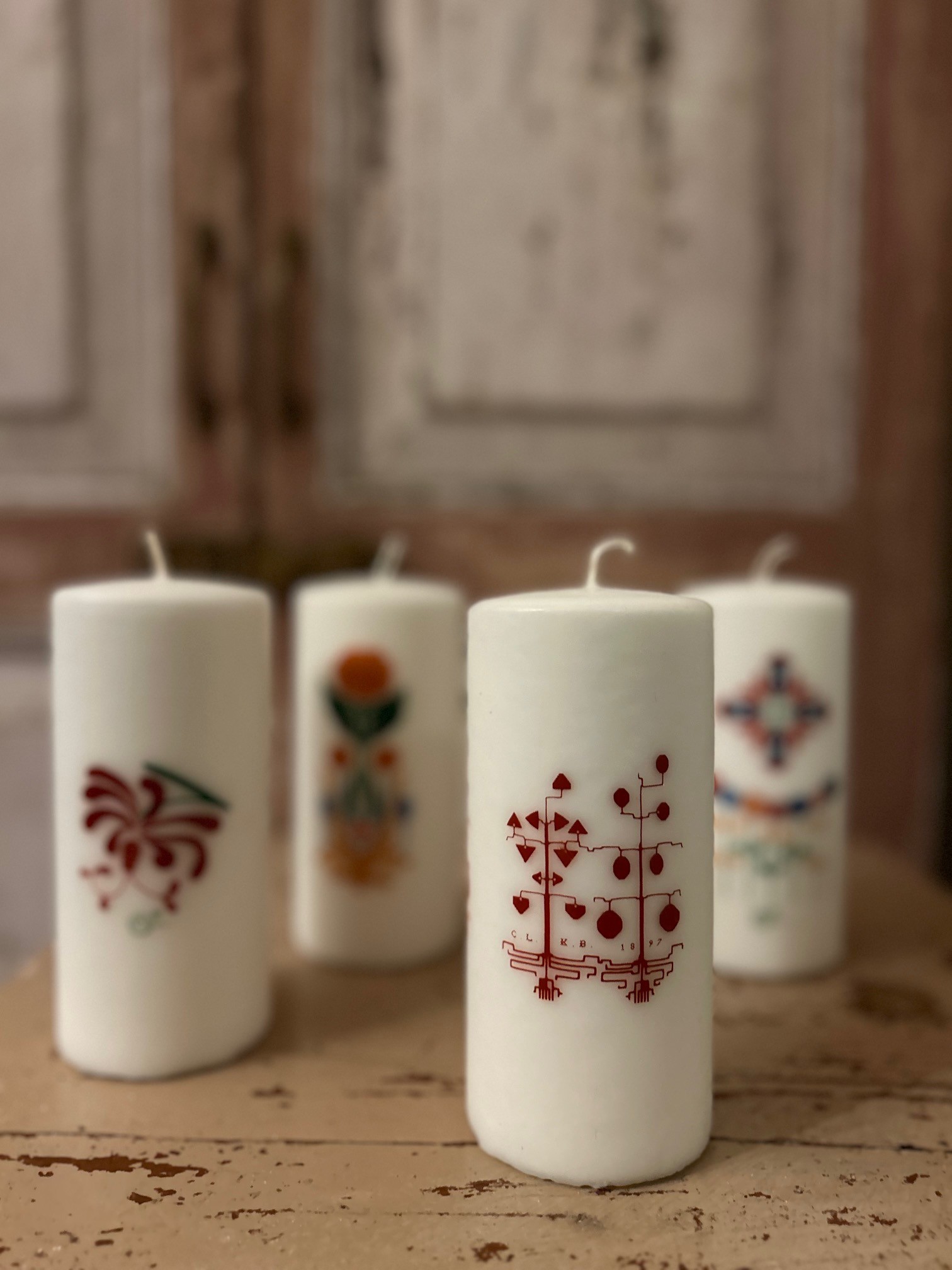 Vitt blockljus med mönster Släktträd från Karin Larssons broderade duk i matsalen. Genuint hantverk av kvalitets-ljus möter en kulturskatt med fokus på Karin Larssons kulörer och design. 100% Svanen-märkt stearin ger lång och fin brinntid med klar låga. Brinntid ca 50h.