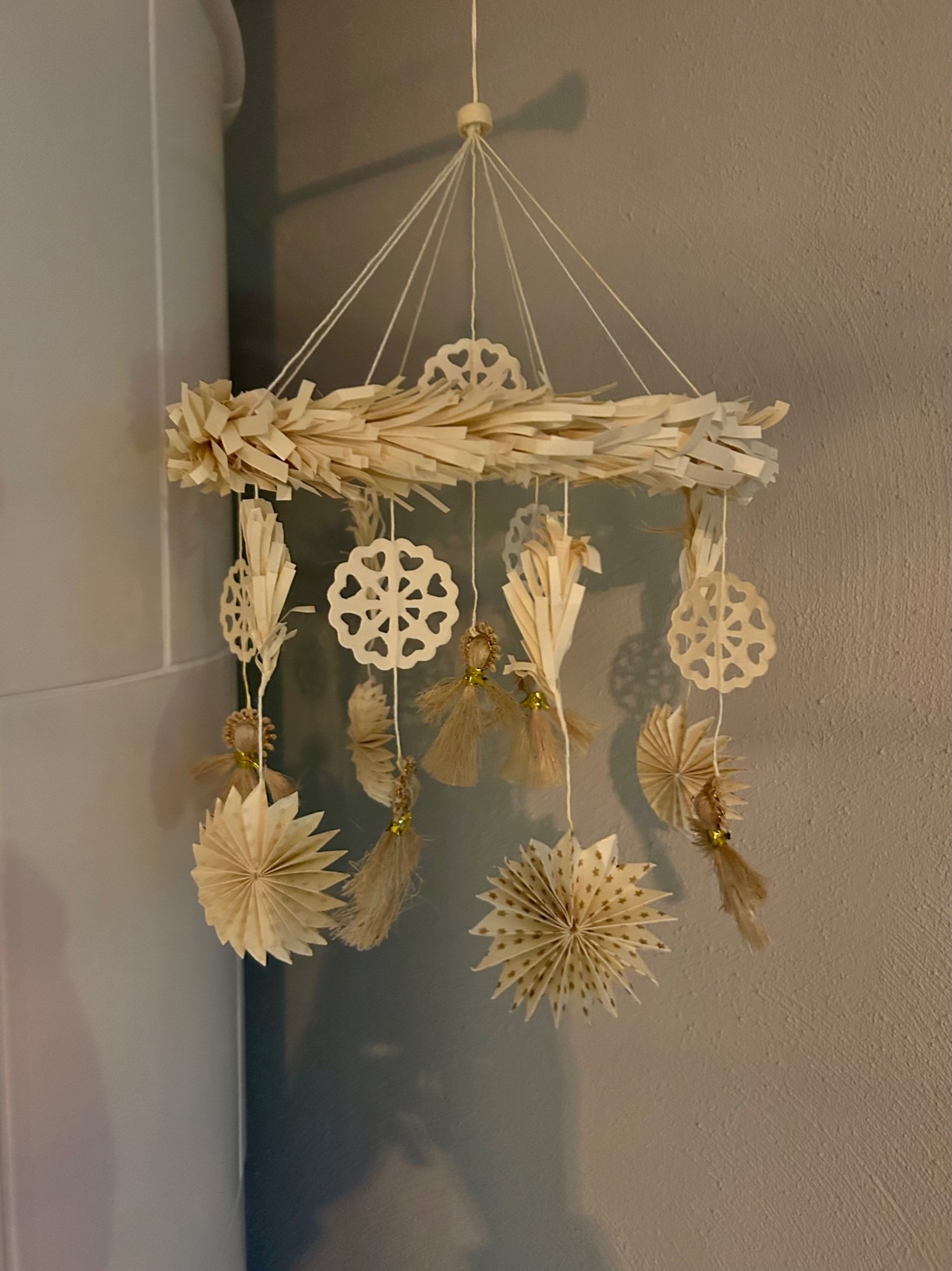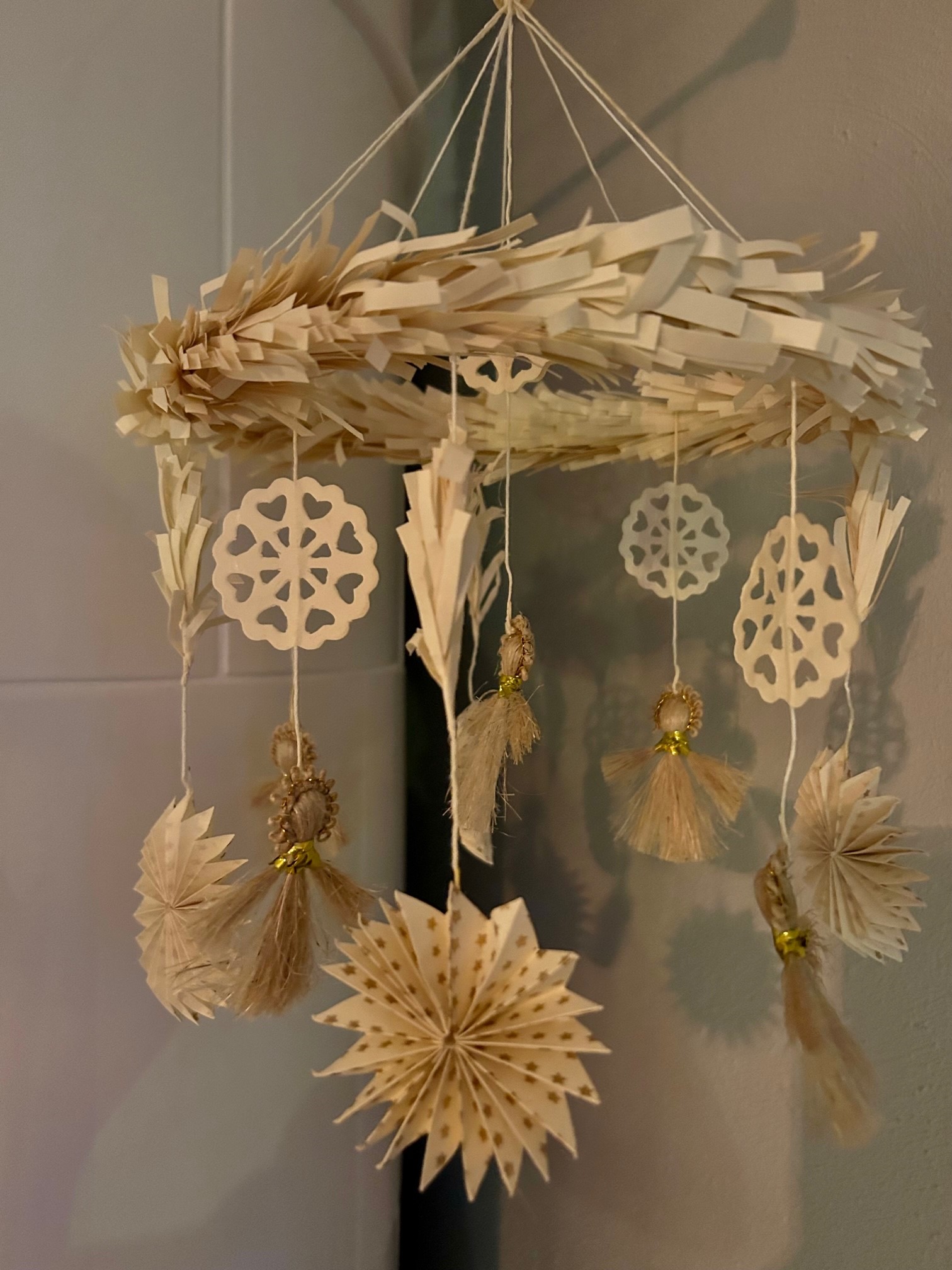 En underbar julmobil med dansande änglar och gnistrande stjärnor. Juldekorationen är tillverkad av handgjort papper och jutefiber.