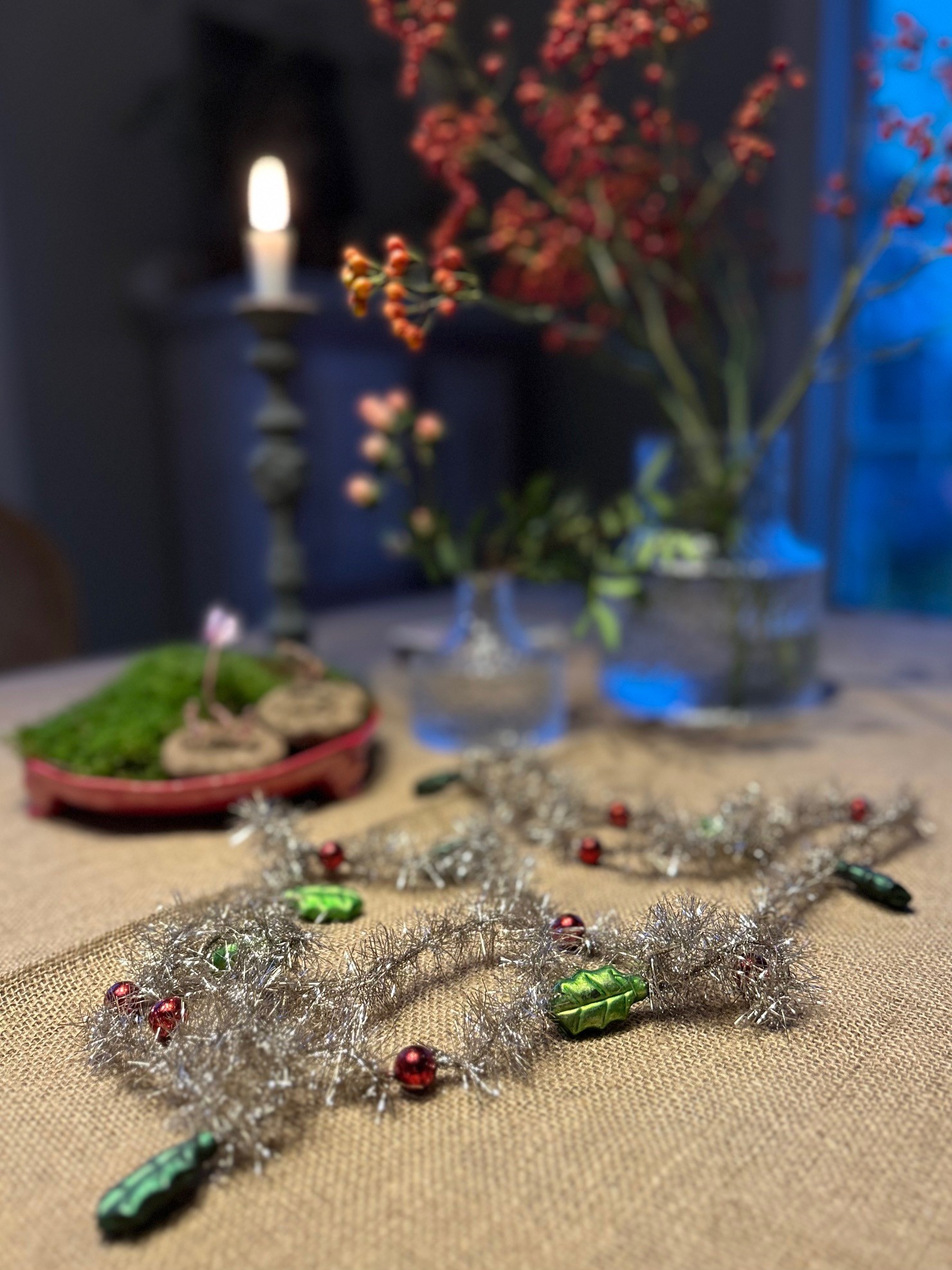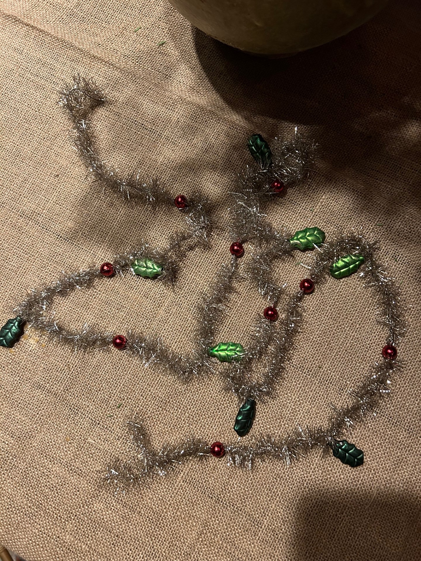 En fantastiskt glitter girlang med mycket nostalgi känsla. Girlangen har små röda glas bär och gröna glas blad i sig. Mycket fint att duka med i mitten på bordet. Glittret är förstås vackert i enris, tallris eller i granen, även fin att hänga i fönster.