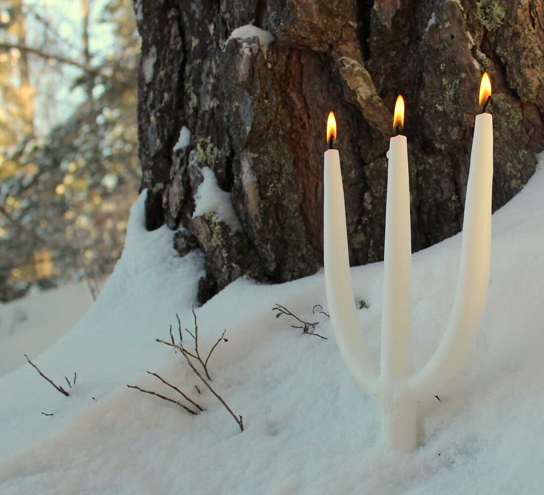 Handstöpta 3-armade grenljus stöps på traditionellt vis av 40% stearin och 60% paraffin. Alla handstöpta ljus innehåller en blandning av dessa råvaror.