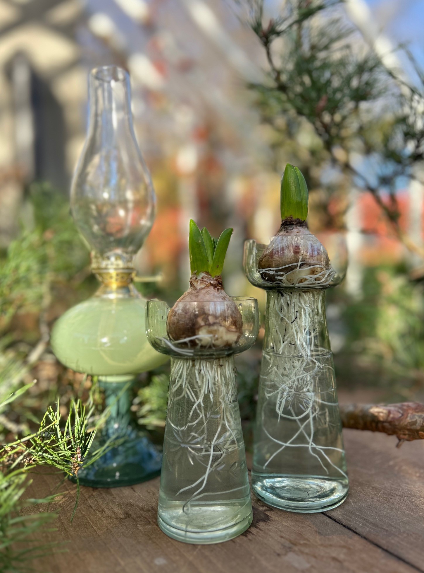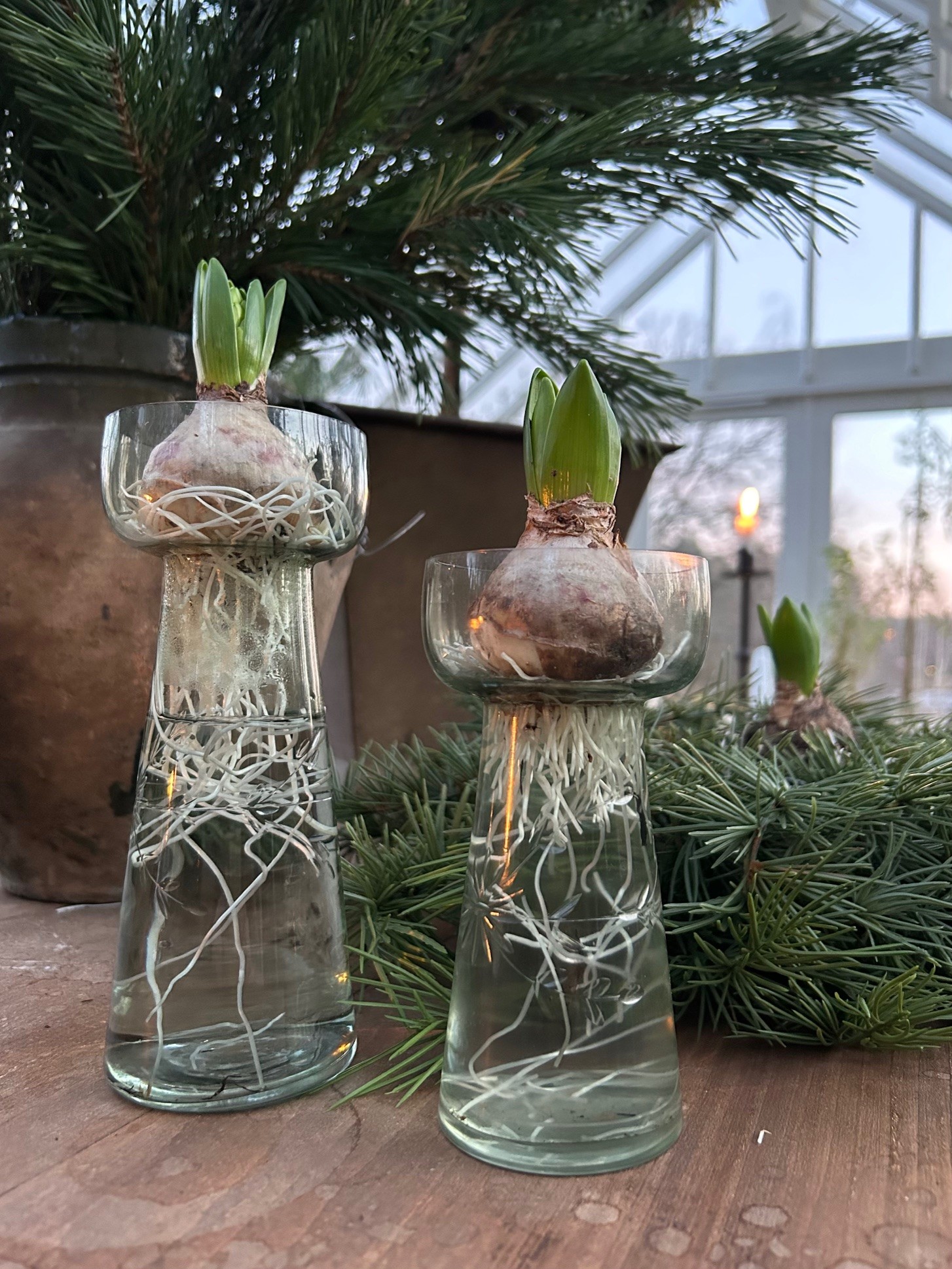 En hyacintvas i grönt glas med en vacker etsad blomma. Perfekt för hyacinter och andra lökväxter. Vasen är tillverkad av 50-60% återvunnet glas.
