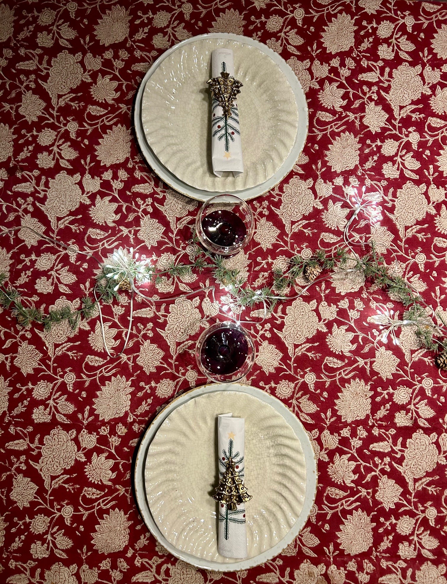 Ta din matupplevelse till nästa nivå med denna utsökta duk, noggrant designad för att frammana den antika orientens eleganta textilier. Indian Rose duken har ett tryck i en djupröd ton, skickligt tryckt för hand med den uråldriga metoden med indiskt träblock. Och tillverkad av oblekt linne av hög kvalitet, Indian Rose-duken har ett tungt fall och vacker textur, samt ett naturligt djup i färg och tryck.