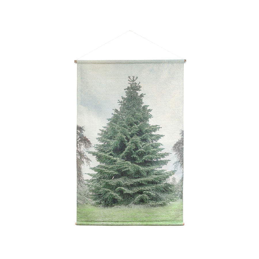 Vacker julbonad med en julgran på duk, med träram och bomullssnöre som upphänge. Bonaden ger ditt hem en härlig julkänsla.