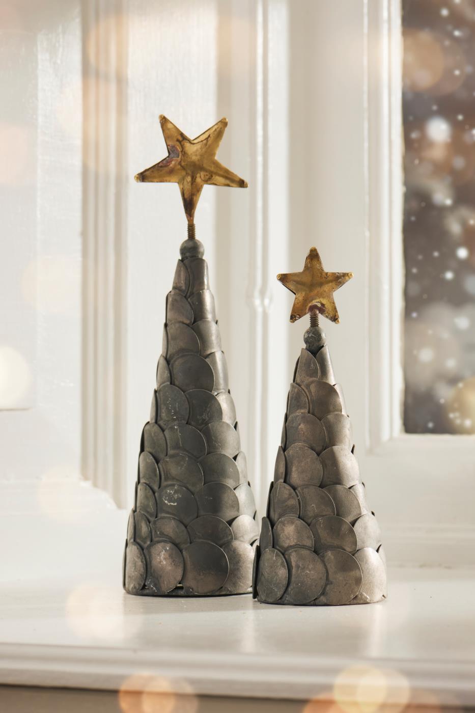 En charmig och udda julgran i metall med dekorativa fjäll och en stjärna på toppen – perfekt för dig som vill ha en lite annorlunda och konstnärlig inställning till juldekorationerna.