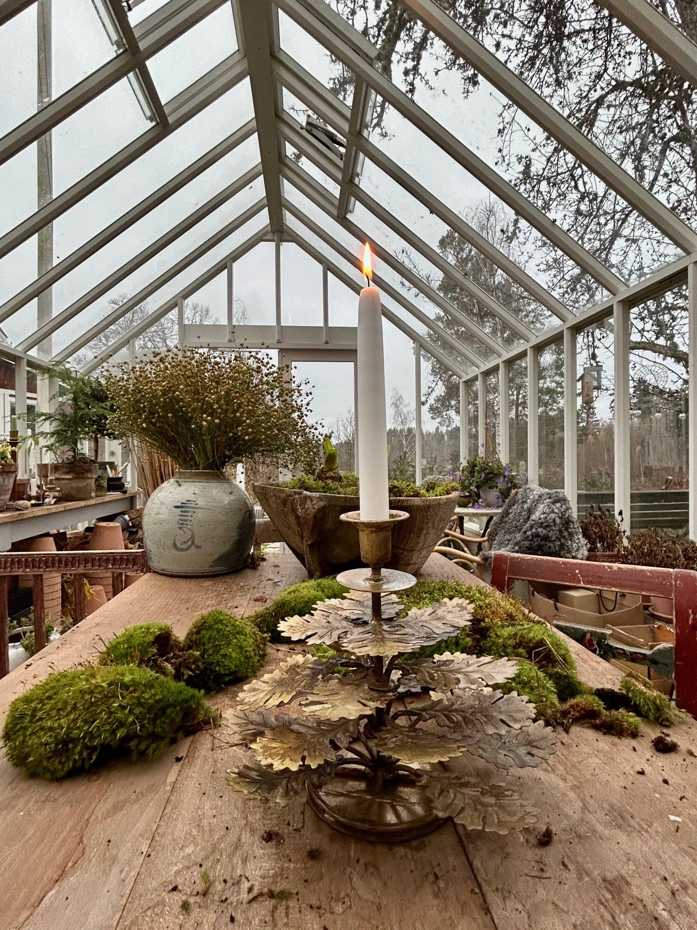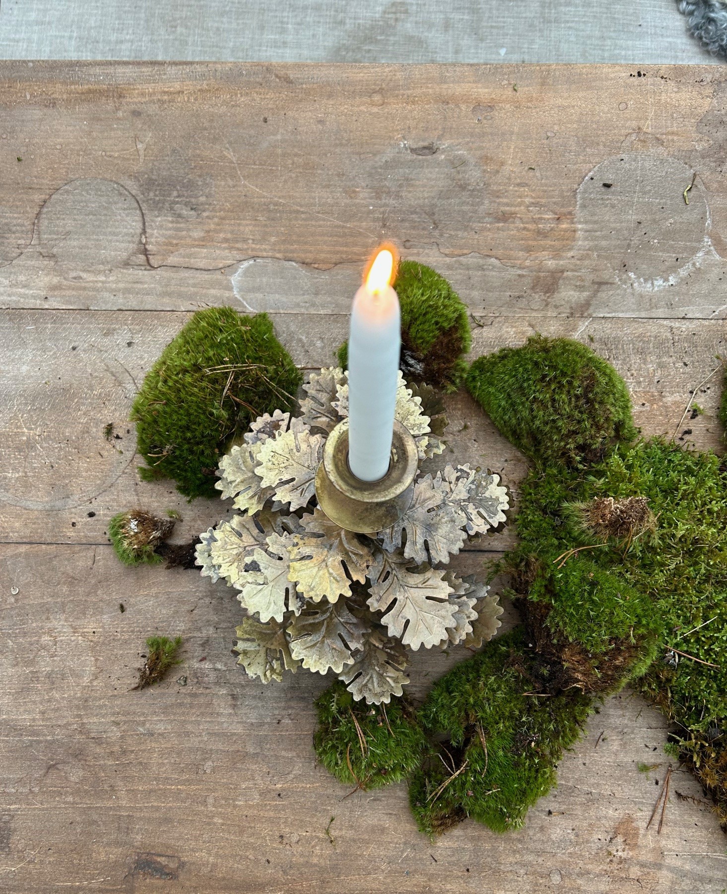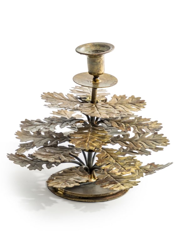 En underbar ljusstake med eklöv i formen som en gran. Ljusstaken är tillverkad i metall med antikfärgad guld finish. Vanliga kronljus/antikljus passar till ljusstaken.
