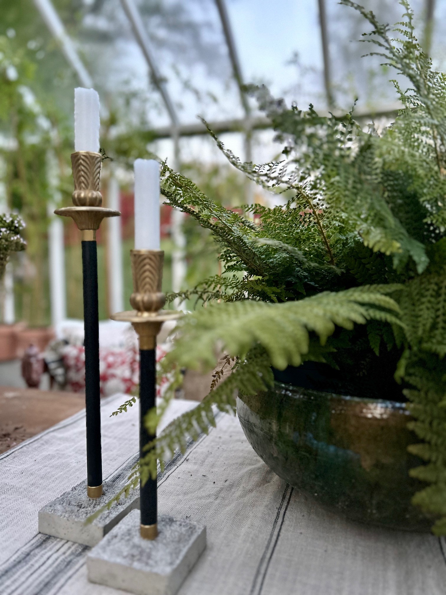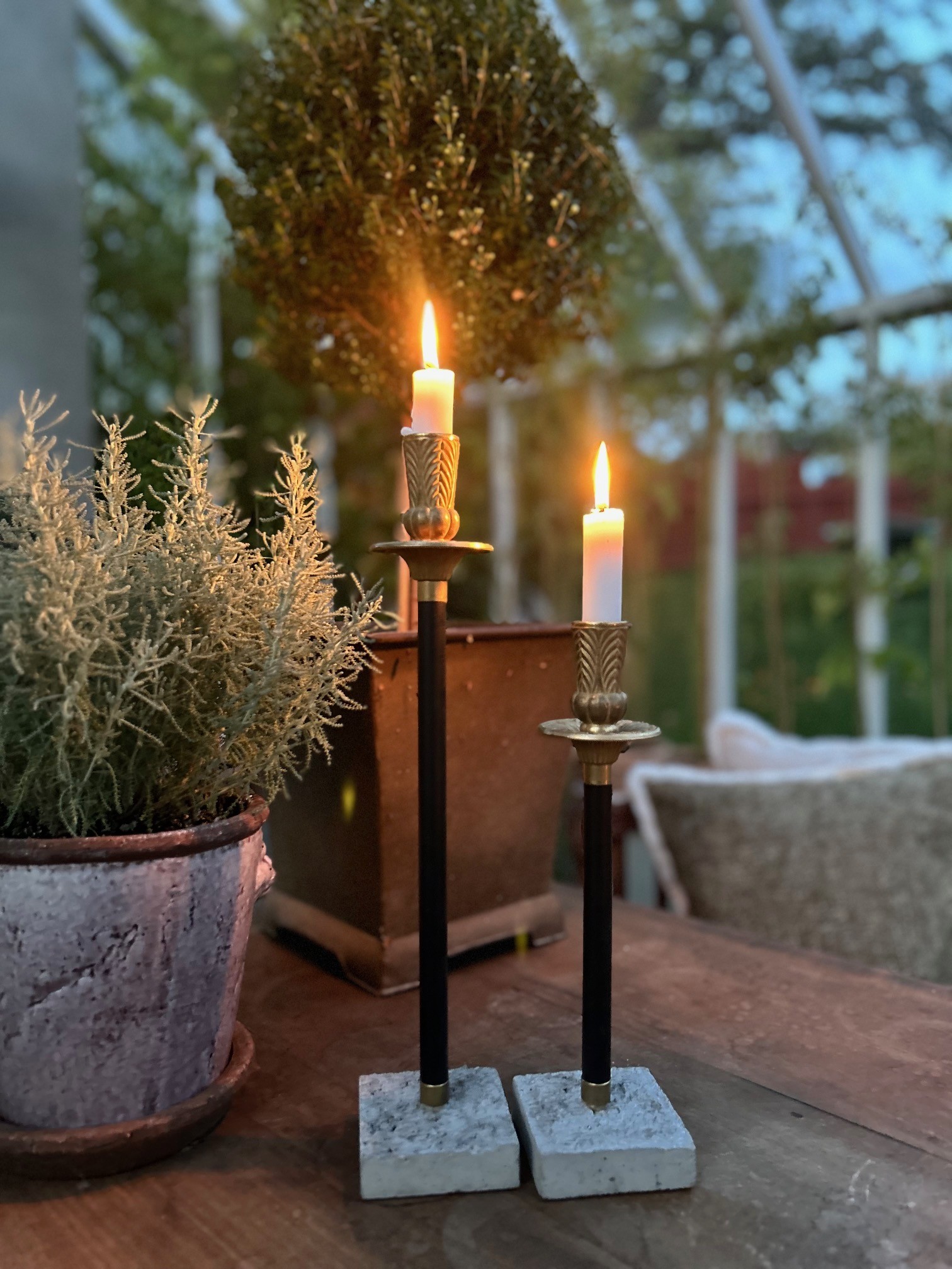 Vacker svensktillverkad ljusstake i rost med cementfot som finns i två höjder.