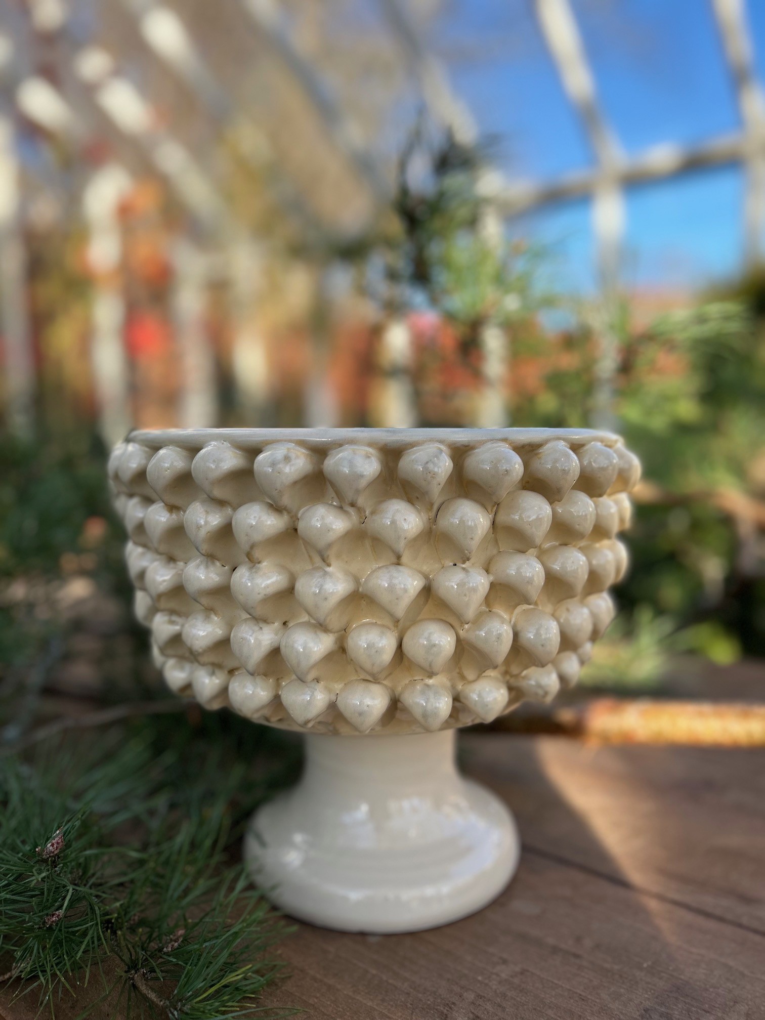 Solanto skål på fot är en handgjord dekorationsskål i keramik. Fantastisk vacker som fruktskål eller som här på bilden med plantering efter årstiden. Färg och finish kan variera då varje produkt är unik.