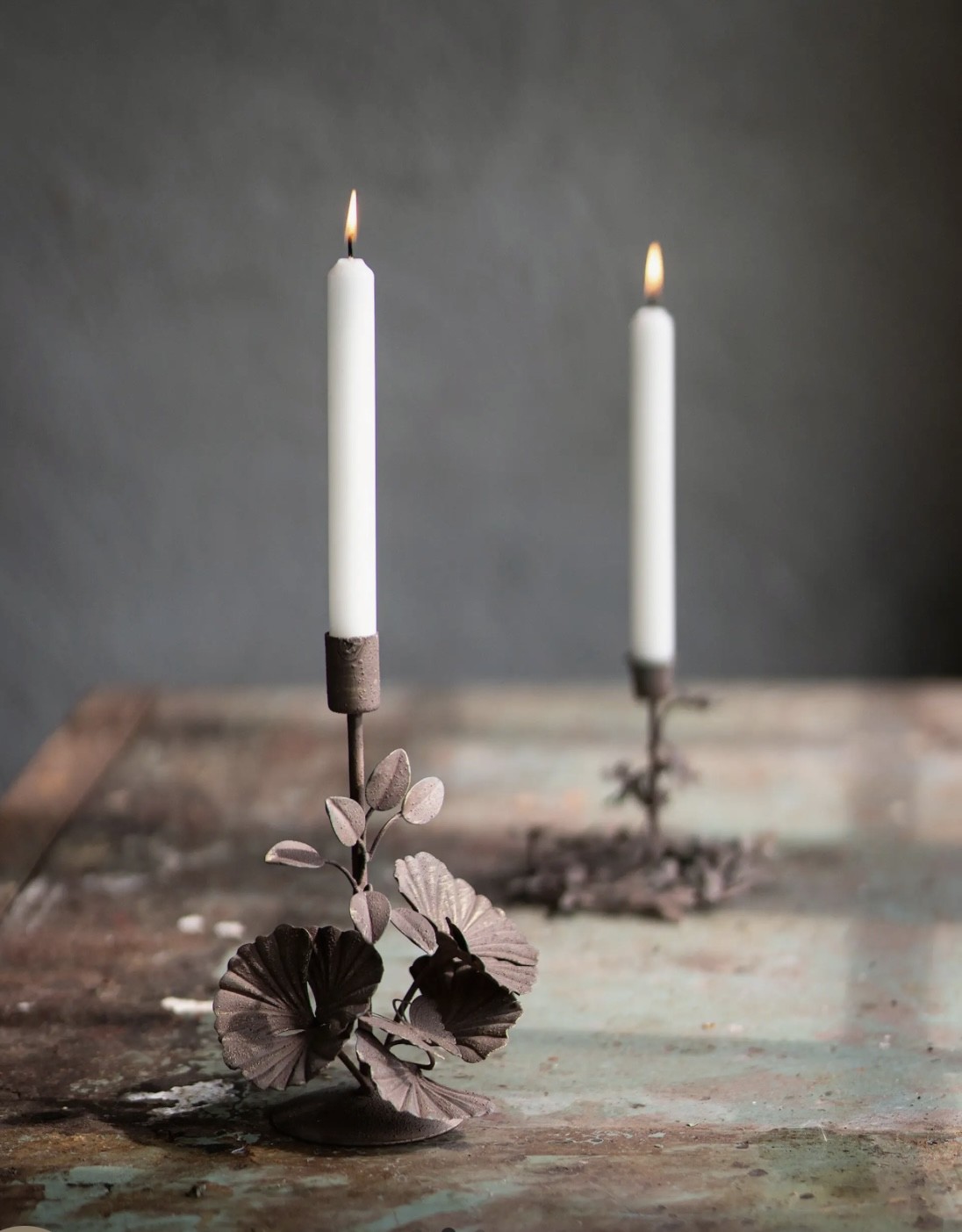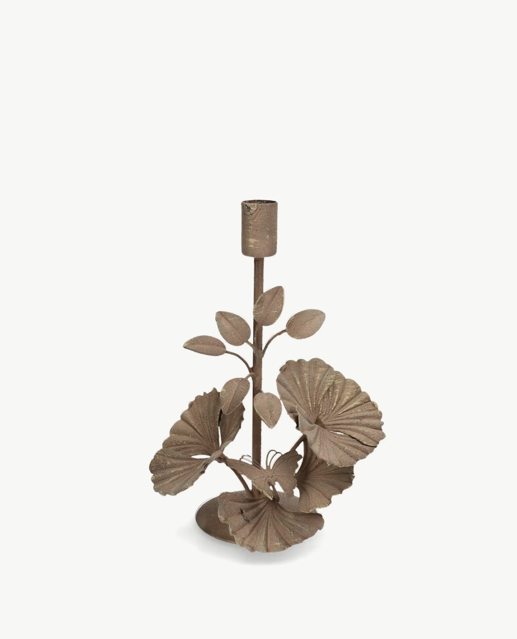 Ljusstake dekorerad med blommor som blir ett fint sätt att få in levande ljus i hemmet. Tillverkad i metall.