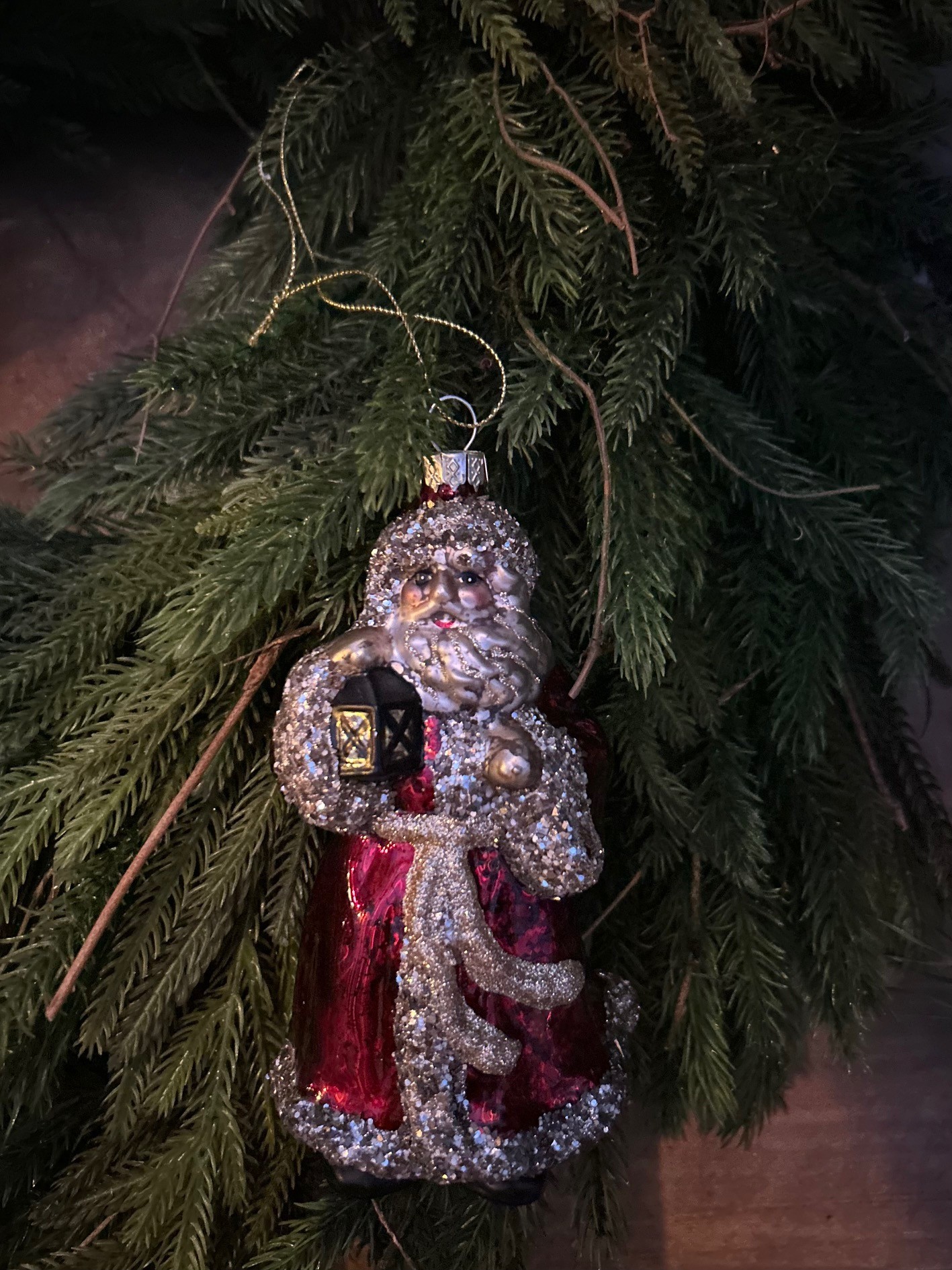 Santa är ett nostalgiskt glas julhänge av en tomte hållande i en lykta. Färgen på tomtens rock är julröd med glitter och vita detaljer. Kommer med tunt guld snöre.