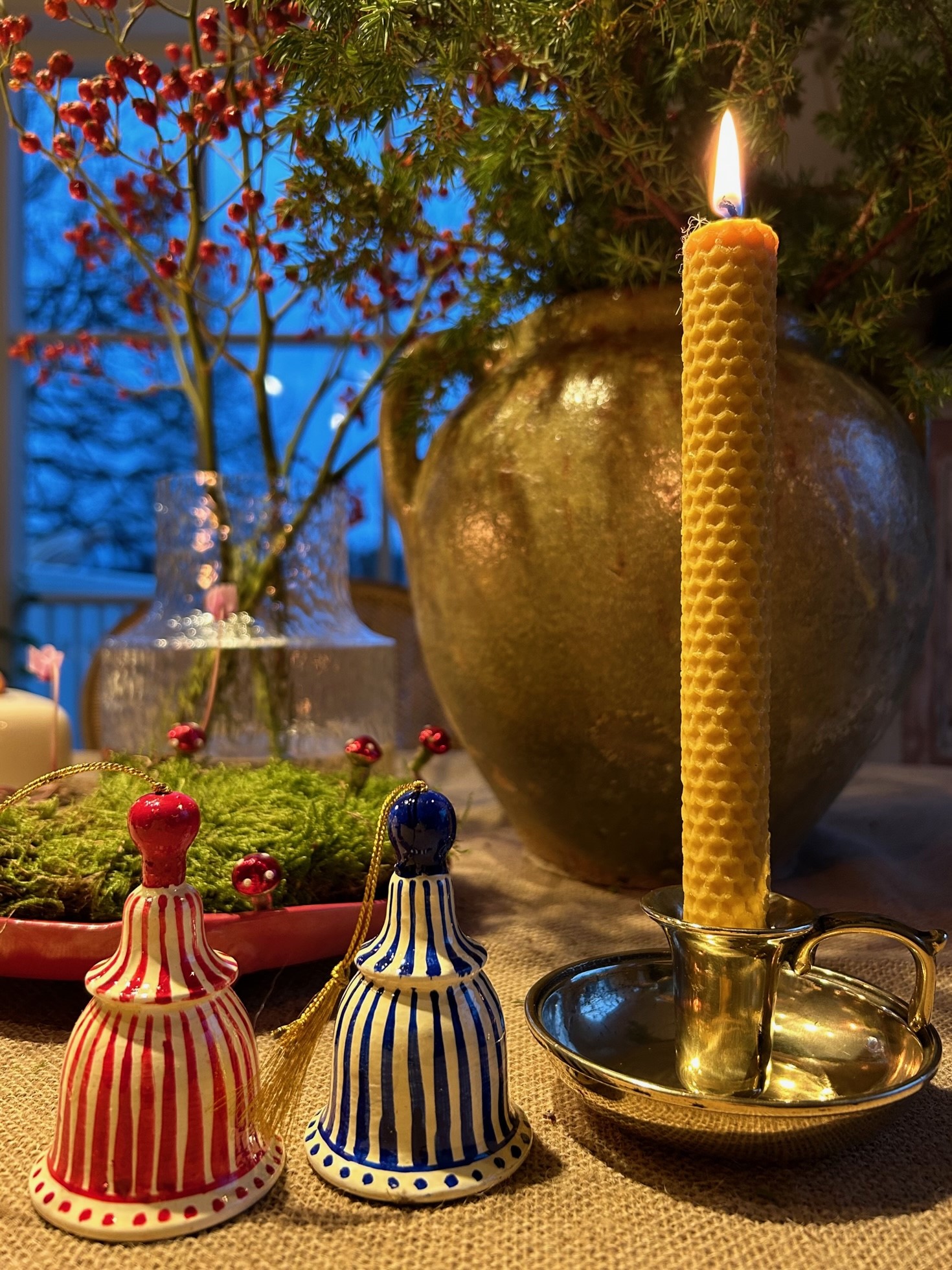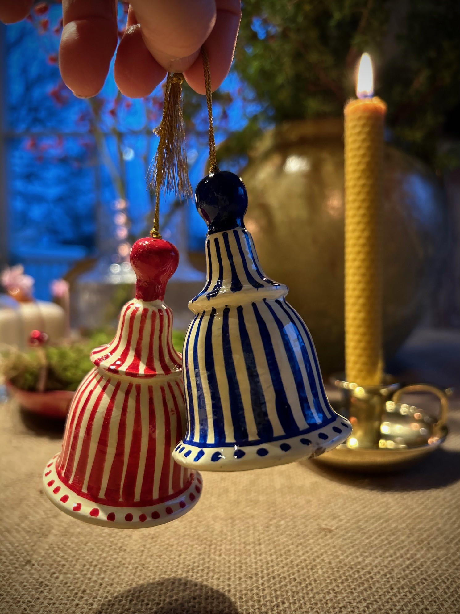 Otroligt fina julgranshängen i form av 2 klockor, röd/vit randig och blå/vit randig, tillverkade i flera lager papper och sen handmålade.