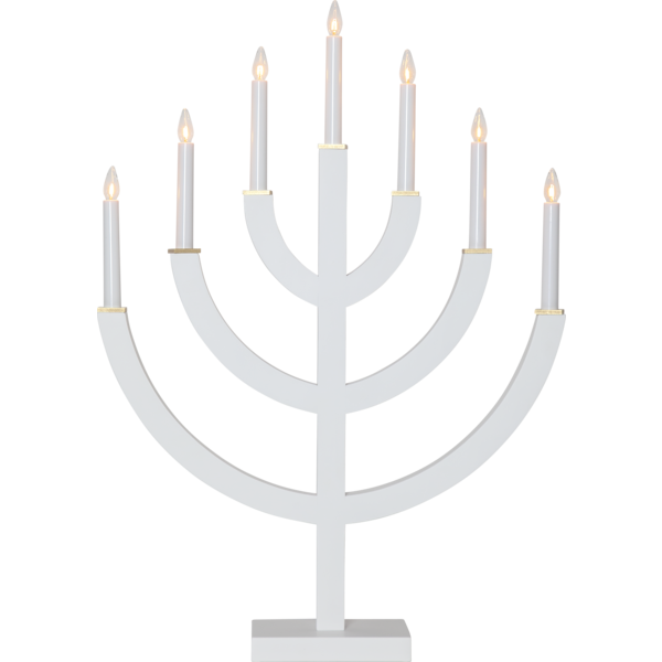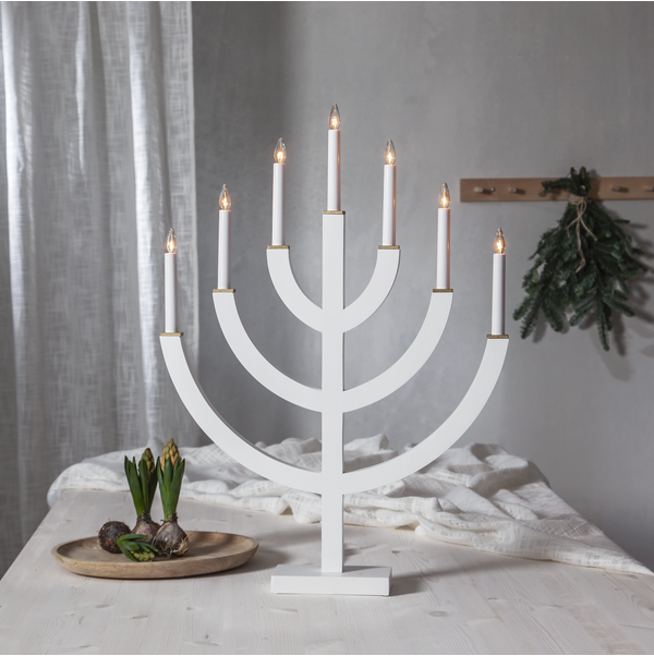 Stämningsfull vit adventsljusstake tillverkad i trä med målade träbrickor i guld som dekoration. Ljusstaken är både moderna och traditionell och passar utmärkt i ett fönster eller på en skänk. Julen blir någt alldeles extra med stämningsfulla Anno som dekoration.
