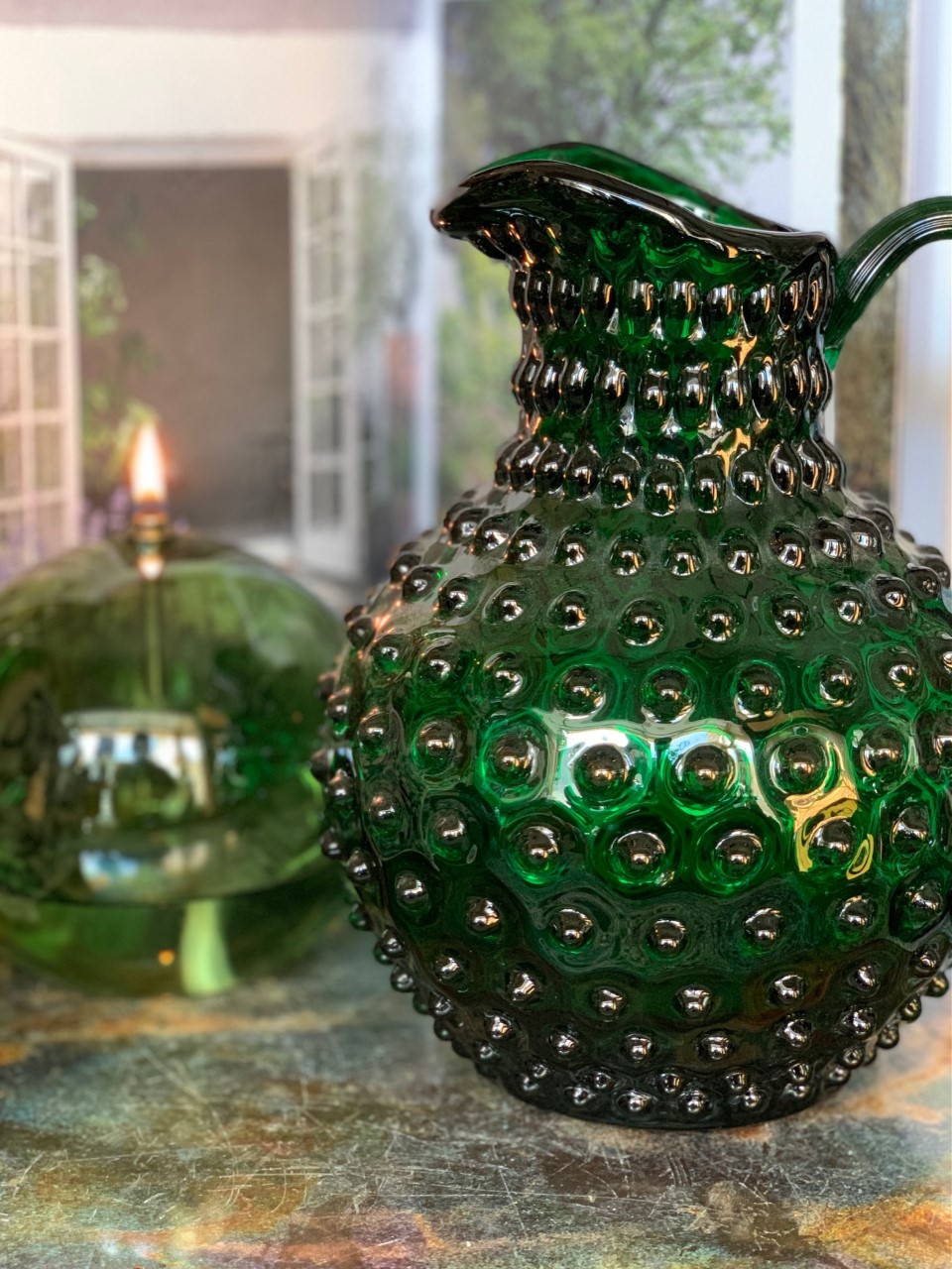 Munblåst glaskaraff med vackert bubbelmönster, i en vacker djup grön nyans.