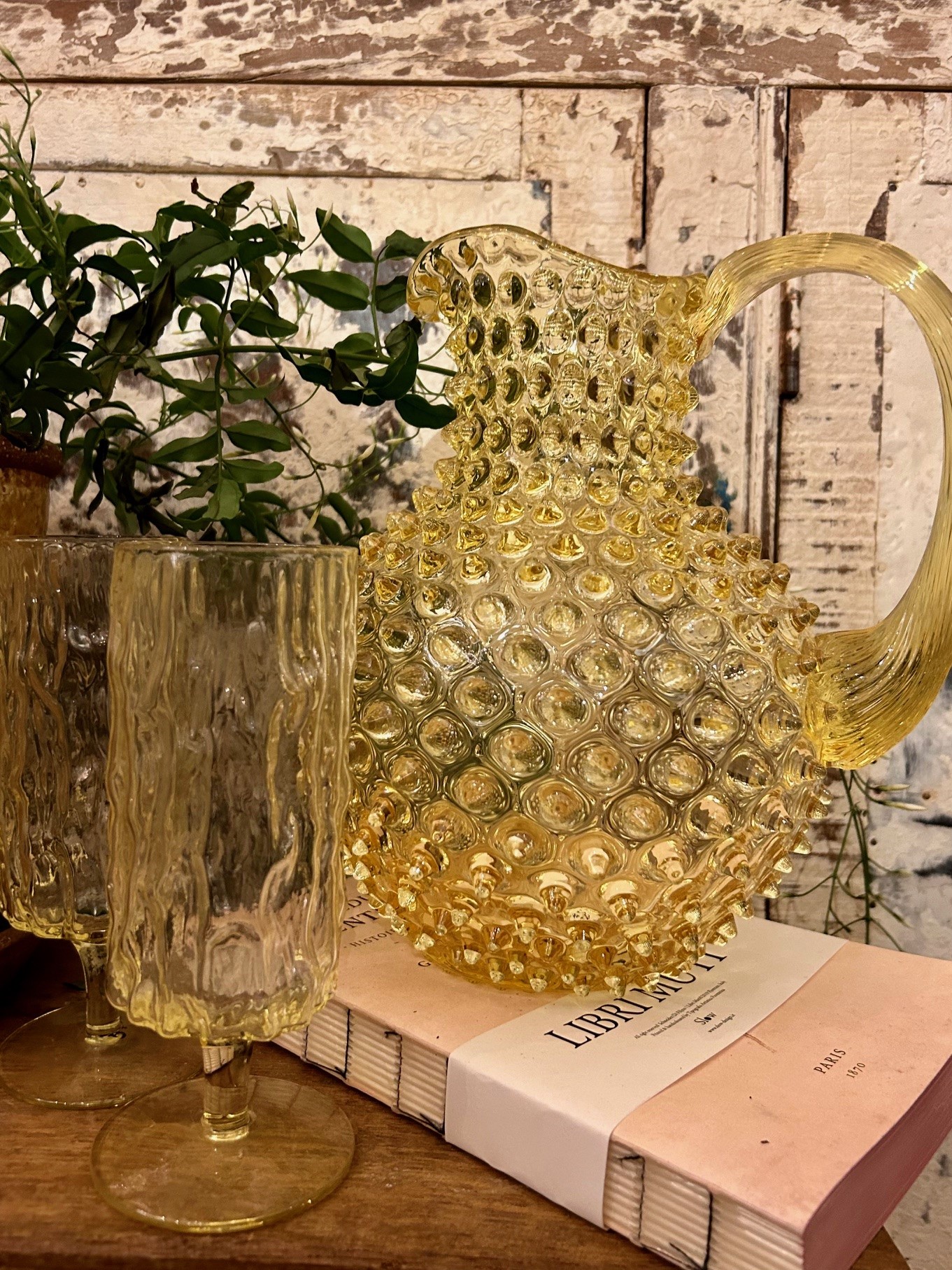 Munblåst glaskaraff i vackert bubbelmönster, i en varmgul färg.