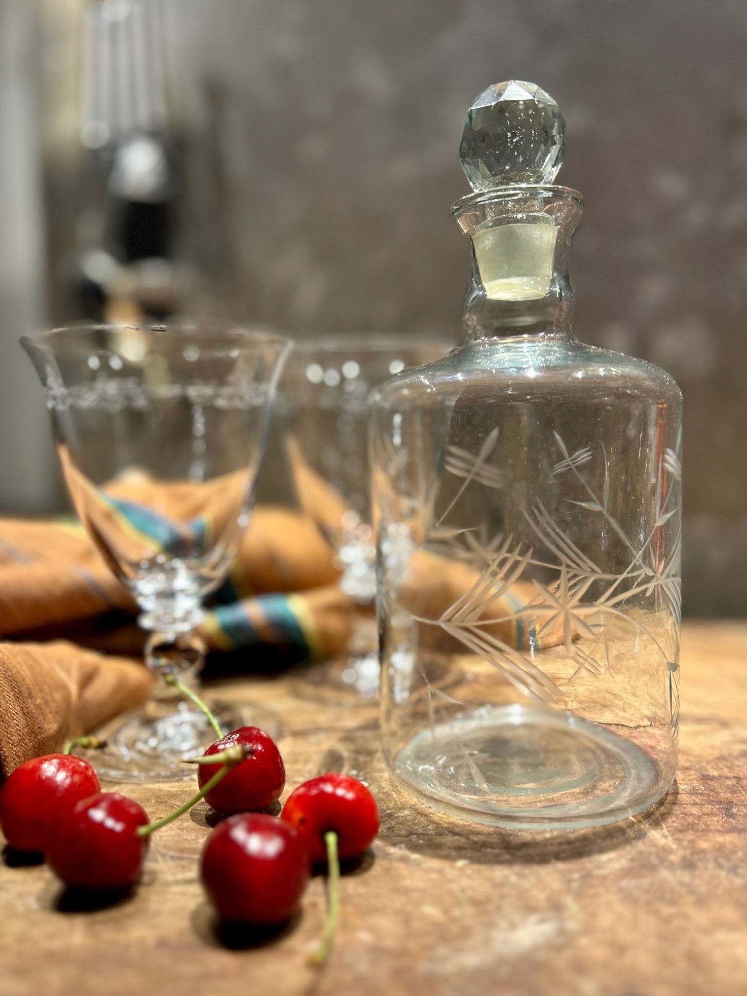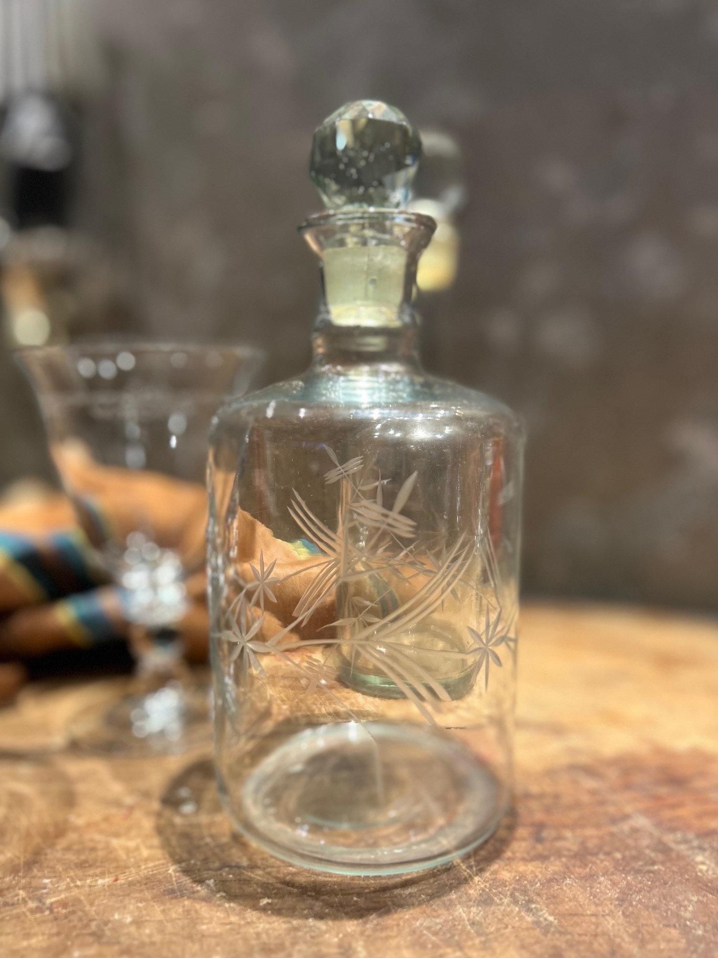 Vacker karaff med ”facett slipad kork” och ristat mönster i glaset.