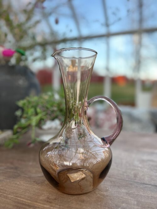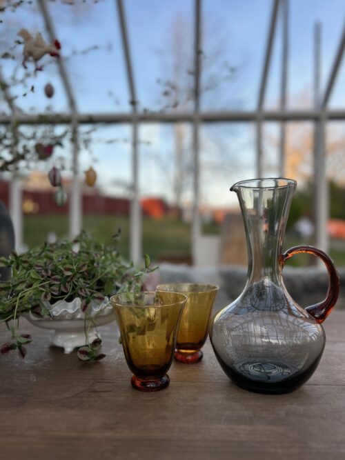Vacker karaff med ”facett slipad kork” och ristat mönster i glaset.