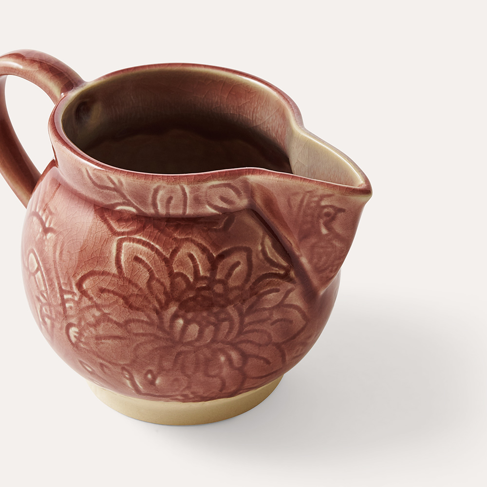En liten kanna för den som önskar en skvätt mjölk eller grädde i kaffet eller téet. Den här underbara kannan är perfekt sällskap till annat i serien Arabesque som exempelvis temugg, teburk, sockerskål. Som all inspirerande keramik från Sthål är den som gjord för bjudningar och kalas. Efter festen hamnar den i diskmaskinen. Vill du värma mjölken innan servering så tål den mikrovågsugn. Glasyren old rose är en så kallad effektglasyr som ger liv och variation åt keramiken. Den flödande glasyren ger en livfull yta som gör varje exemplar blir unik.