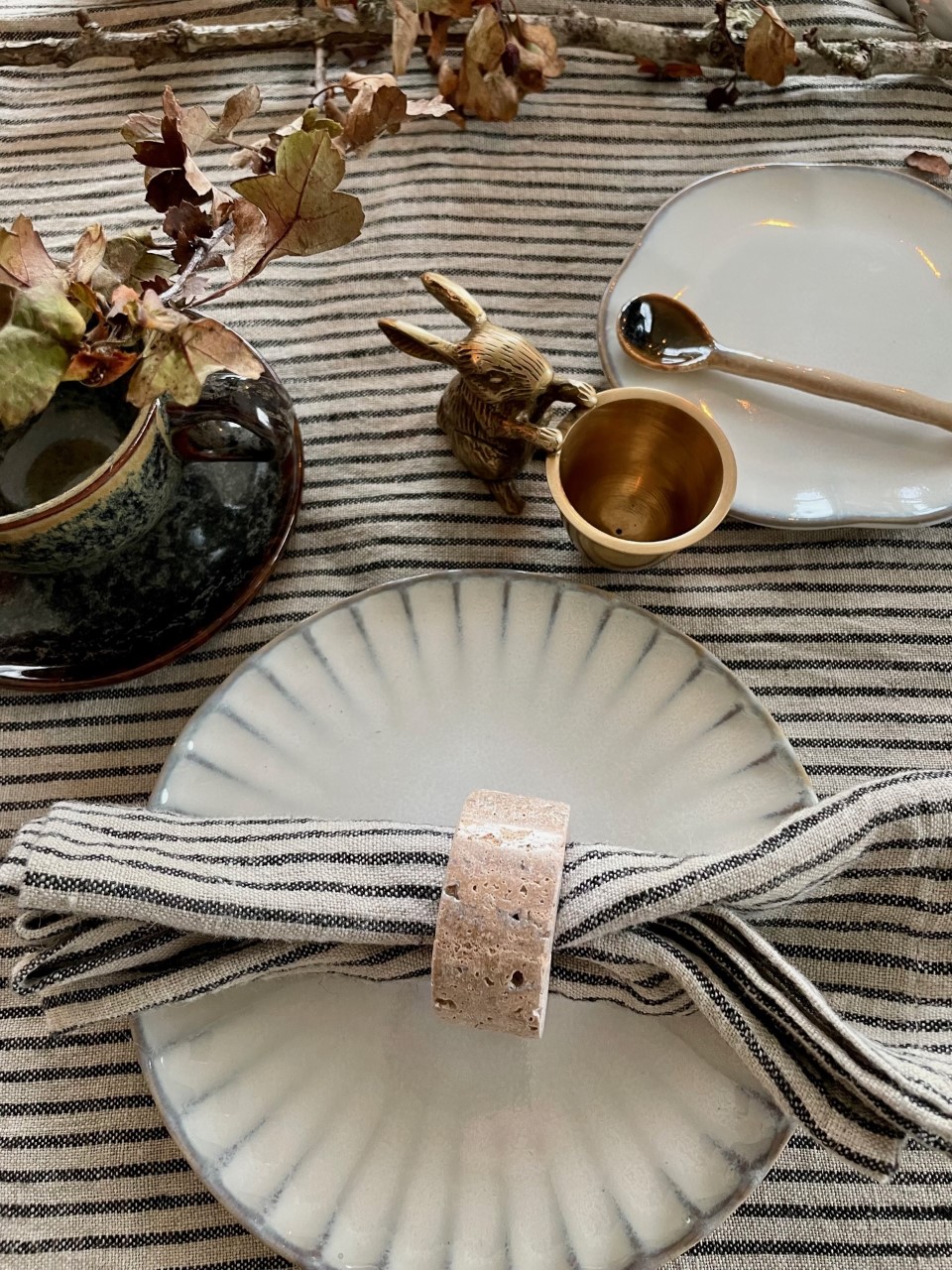Vacker enkel servettring i travertin, som är en typ av kalksten. Eftersom det är ett naturmaterial så är ingen ring lik den andra, alla ser olika ut och kan därmed skilja sig från den på bilden, charmigt tycker vi.