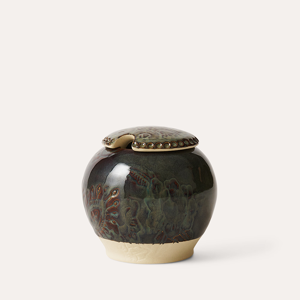 Sthåls sockerskål i serien Arabesque har en utsökt form som gör den heliga testunden eller kafferasten till något alldeles extra. Den kan gott alltid stå framme som ett dekorelement. Sockerskålen kommer i flera vackra glasyrer som alla matchar med varandra. Just glasyren fikonbrun är en så kallad effektglasyr med små fina krackeleringar som ger liv och variation åt keramiken. Den flödande glasyren skapar en livfull yta med skiftande färgtoner vilket gör varje exemplar unik. Att sockerskålen är en del av Sthåls kollektion Arabesque framgår av det vackra mönstret som tecknar sig i keramiken.