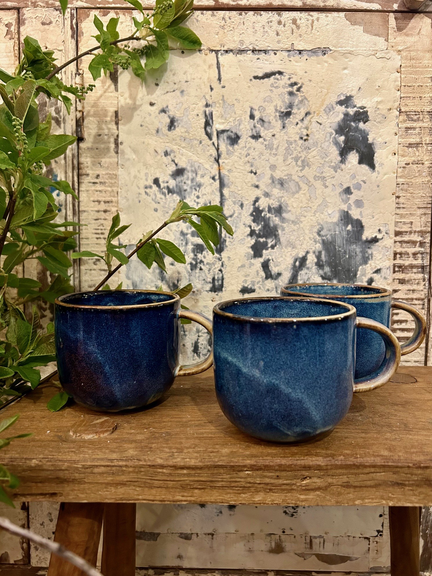 Rustik mugg med öra i härliga nyanser av blått med inslag av brunt i kanterna. En mugg som är unik med lite olika nyanser av färger och med olika subtila mönster av matt och glansig finish på grund av den reaktiva glasyren som skapas genom naturliga effekter och spontana reaktioner som uppstår i ugnen.