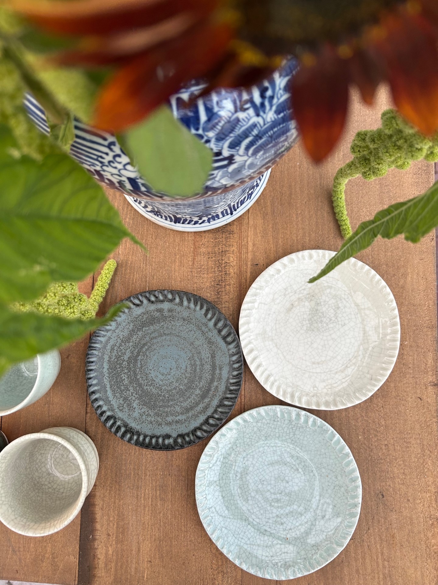 Dashi assietter är keramik i fint krackelerad yta med organisk charm i oregelbundet material och askiga glasyrer.