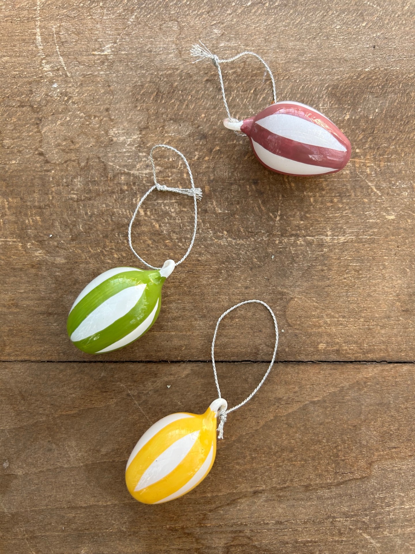 Munblåsta glasägg som kommer i 3-pack med tre olika färger, gul/grön/rosa – randiga dekorativa ägg. Bubblor och ojämnheter kan förekomma.
