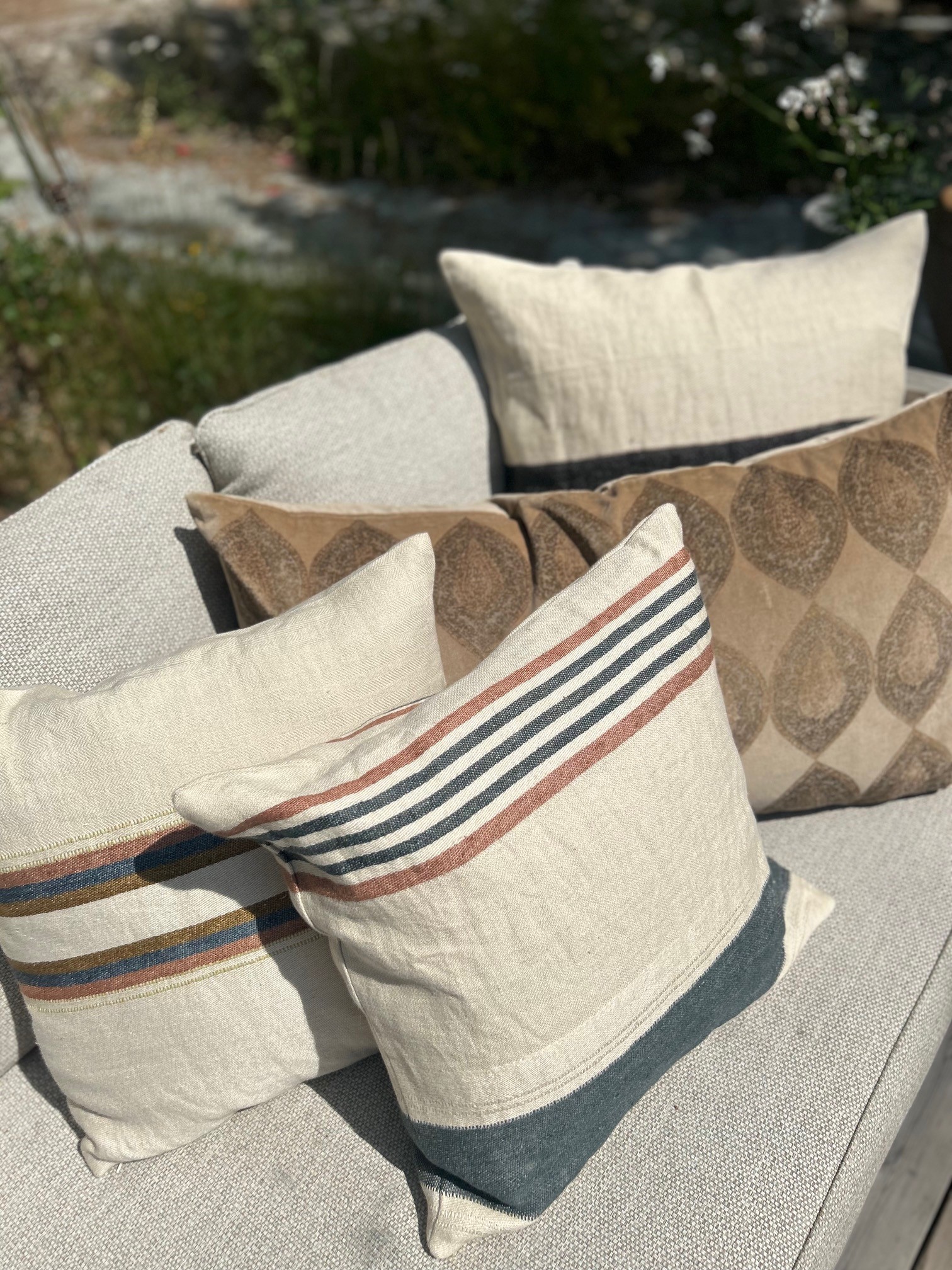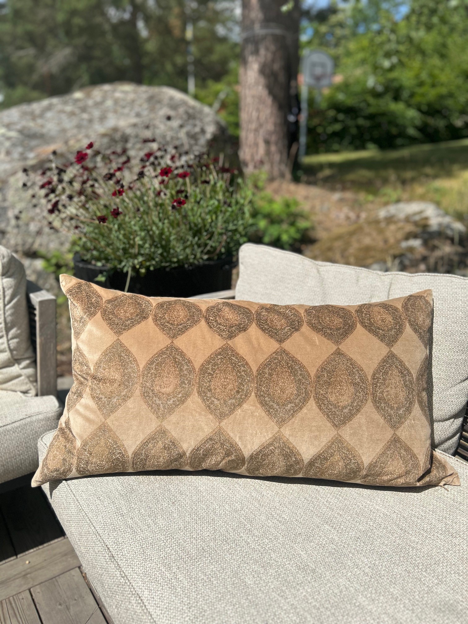 Vackert kuddfodral i varm beige ton, nästan lite guldigt, med blocktryckta medaljonger. Aurelia är en större kudde, mått 50x90xm, som är perfekt som gavelkudde i sängen eller till den större soffan.
