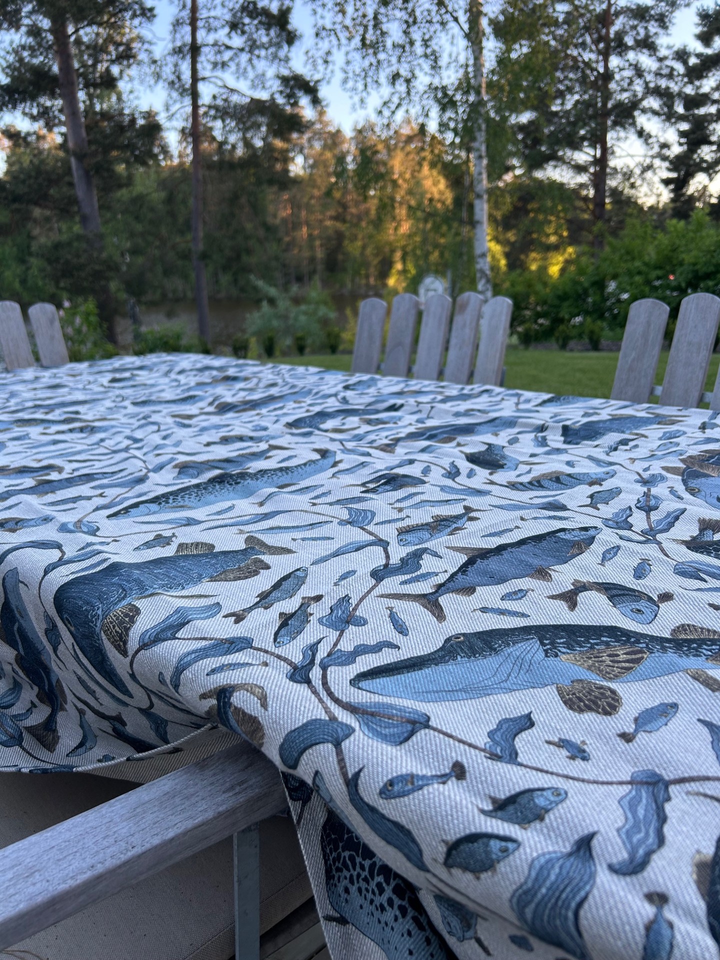 Bordsduken HavsLiv i färgen ÄlvBlå är en svensk linneduk tillverkad i Hälsingland i 100 % linne. Med unik mönsterdesign och miljöcertifierade material.