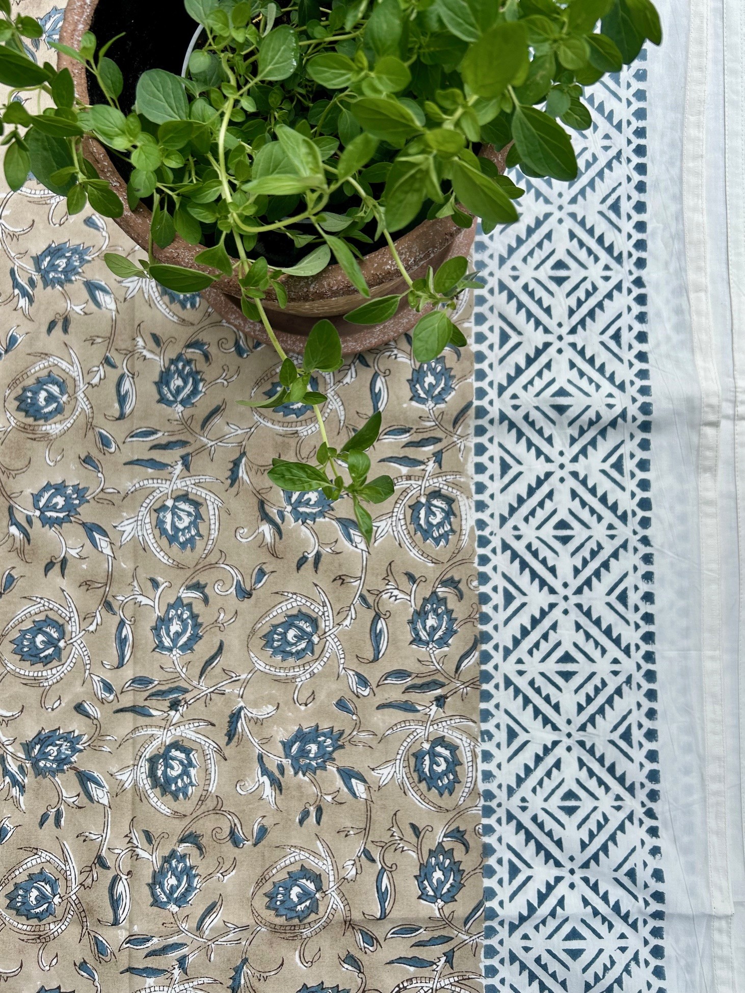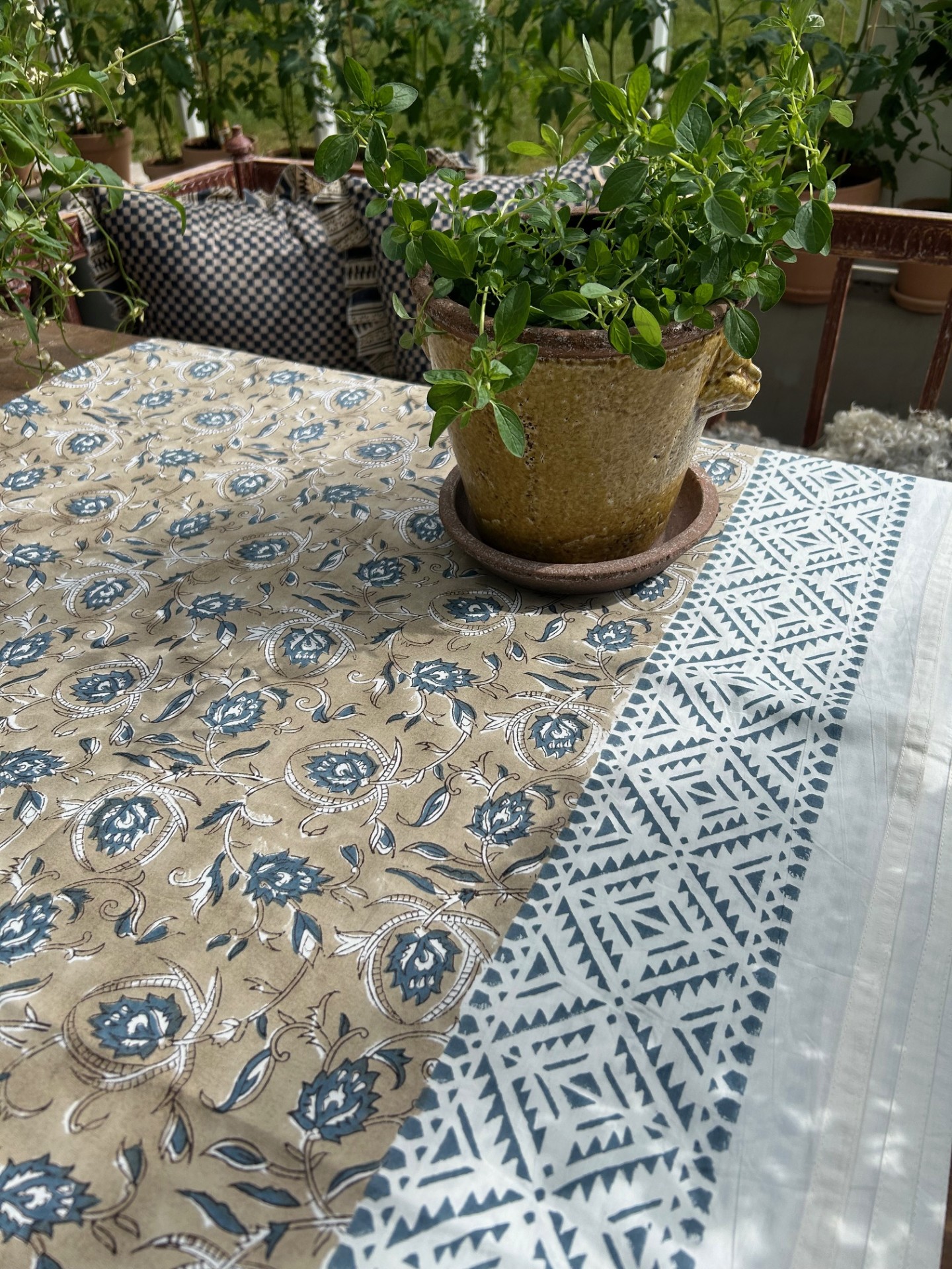 Florian duk är en handtryckt duk i 100% bomull i milda blå/beige/offwhite toner.