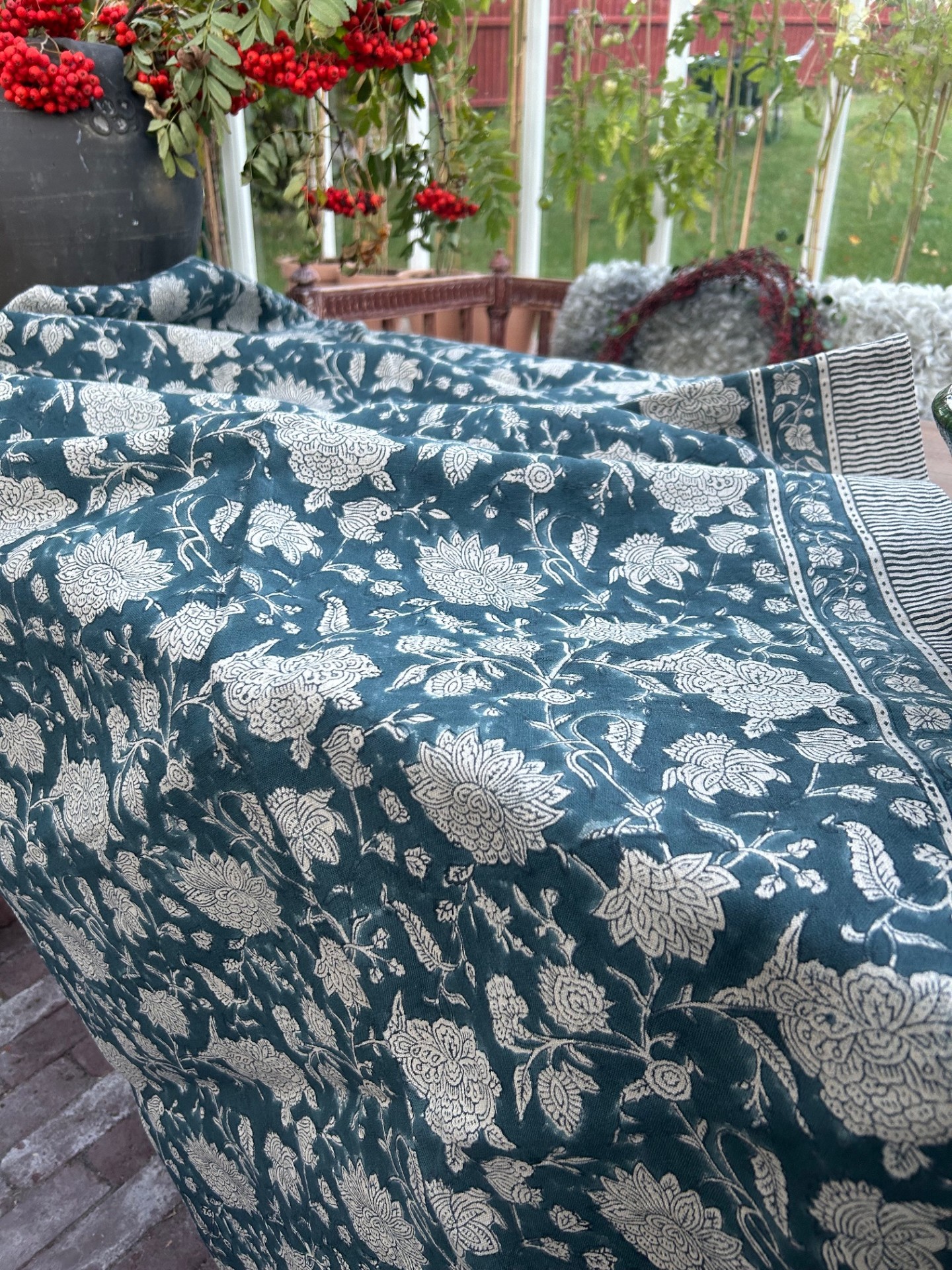 Ta din matupplevelse till nästa nivå med denna utsökta duk, noggrant designad för att frammana den antika orientens eleganta textilier. Indian Rose duken har ett tryck i en djupblå ton, skickligt tryckt för hand med den uråldriga metoden med indiskt träblock. Och tillverkad av oblekt linne av hög kvalitet, Indian Rose-duken har ett tungt fall och vacker textur, samt ett naturligt djup i färg och tryck.