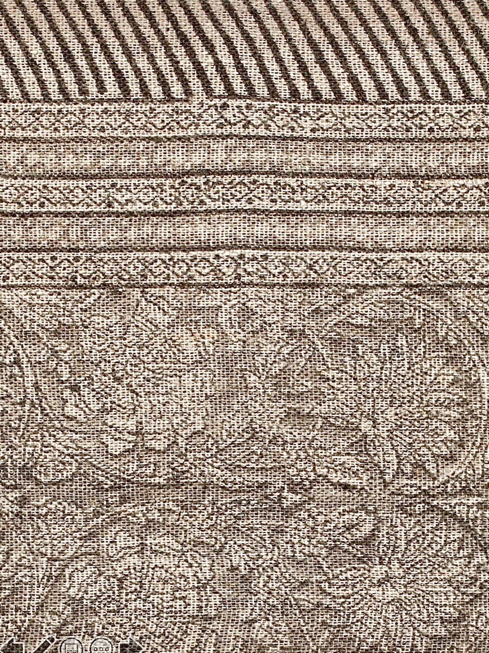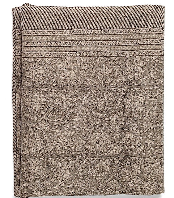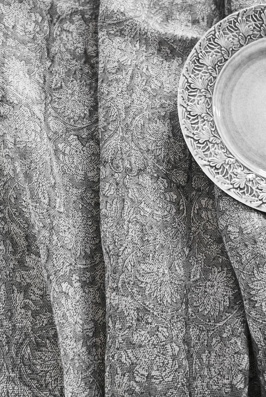 Linneduk med ett handtryckt mönster. Linnet är oblekt, med ett kraftigt fall och vacker konsistens.