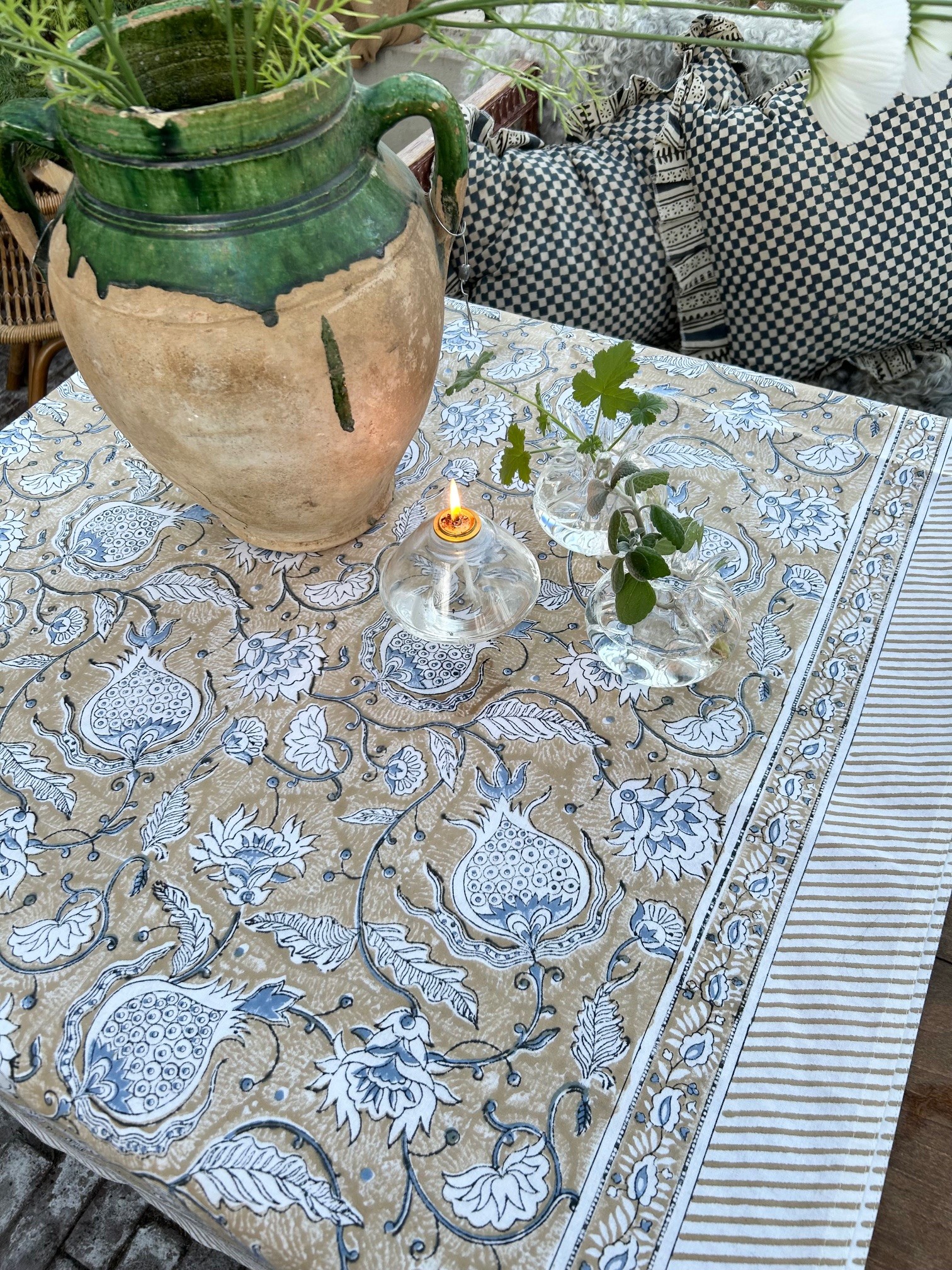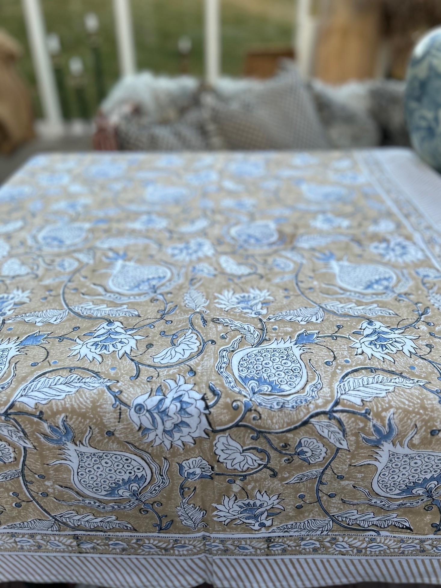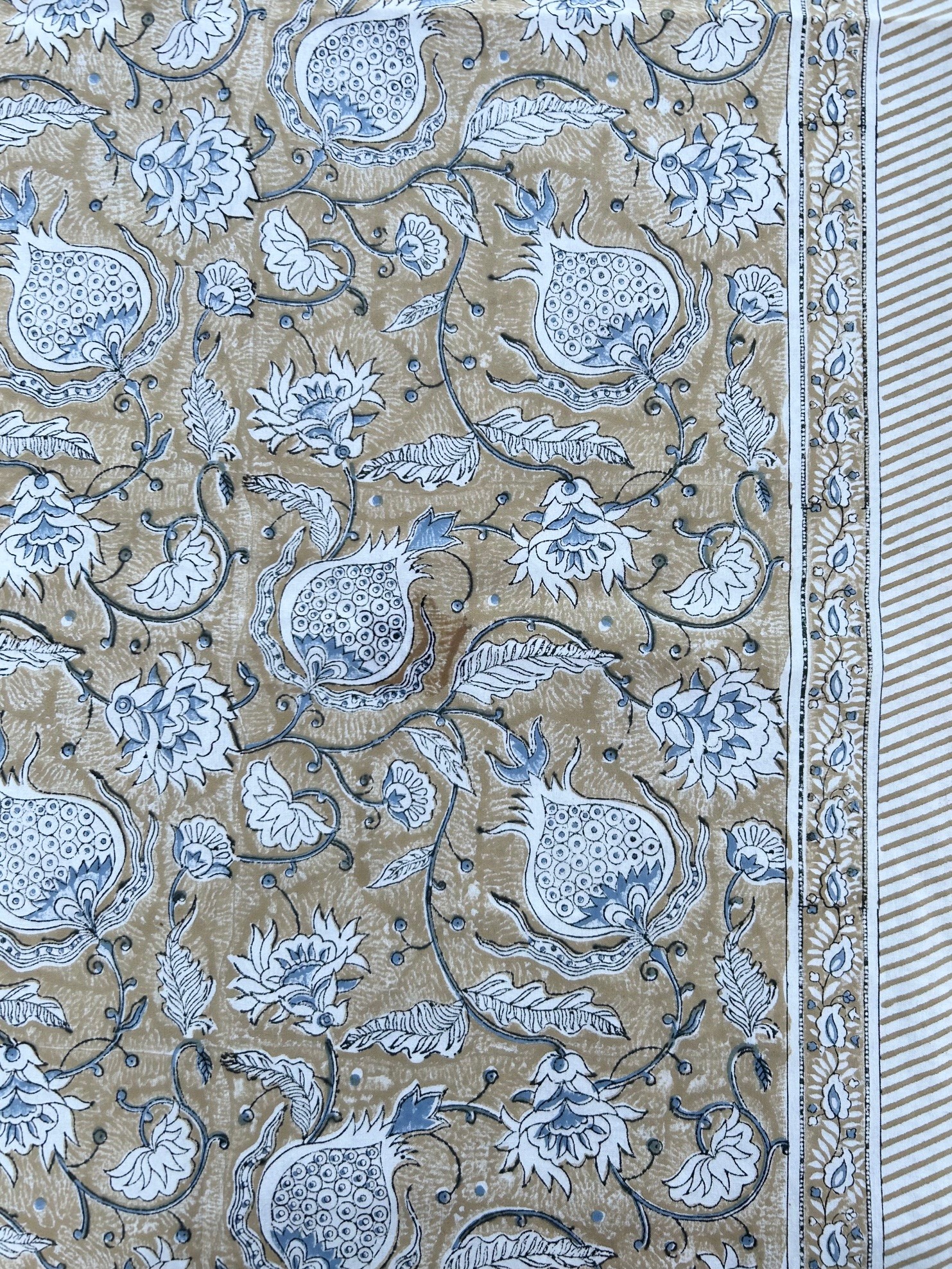 Pomegranate är en duk i naturlig bomull. Blocktryckt för hand. Diskret och vackert mönster.