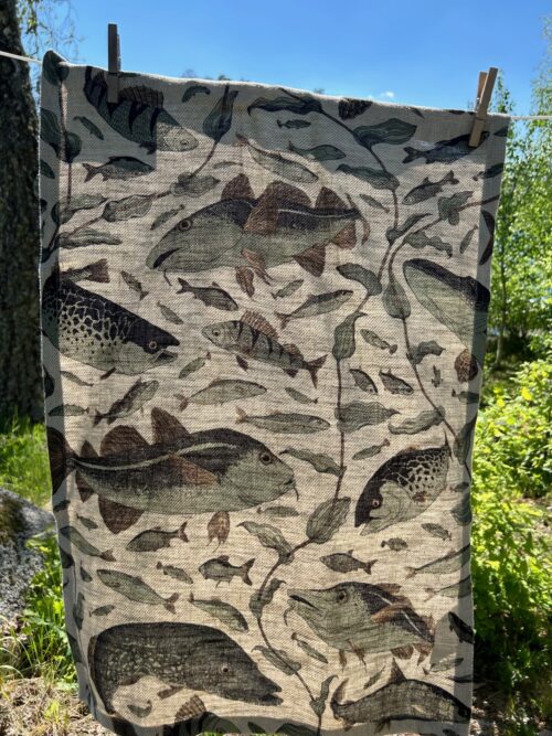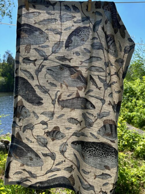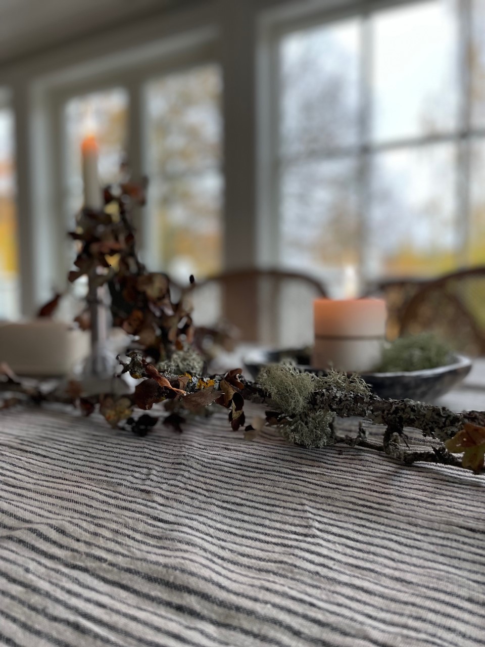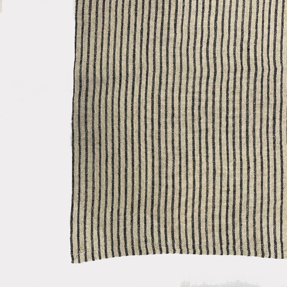 Vacker linneduk i naturfärg med svarta linjer, tidlös och rustik i sitt uttryck. Det finns linneservetter i samma tyg eller enfärgade linneservetter i natur. Kan det bli vackrare!