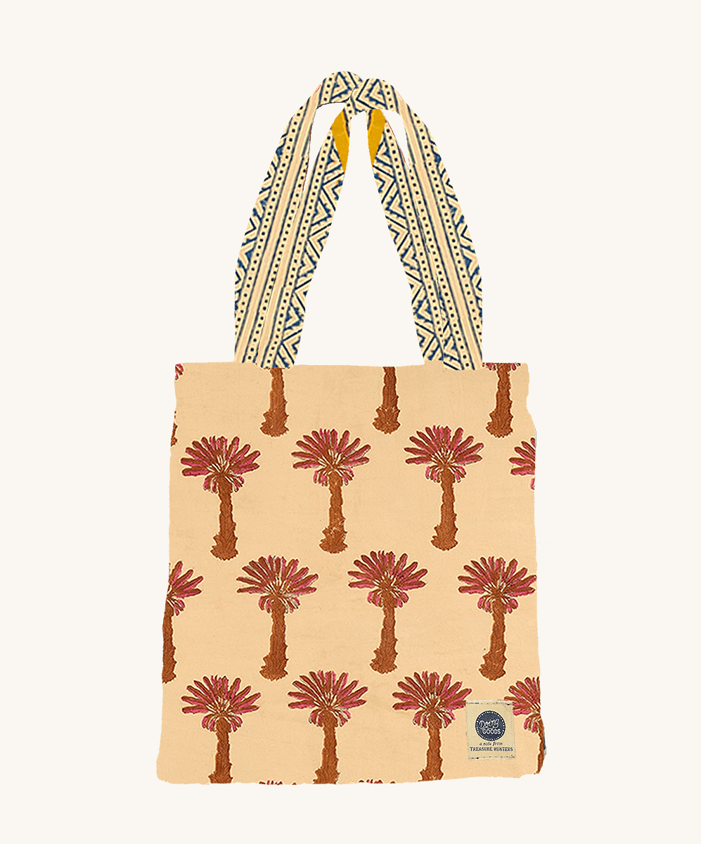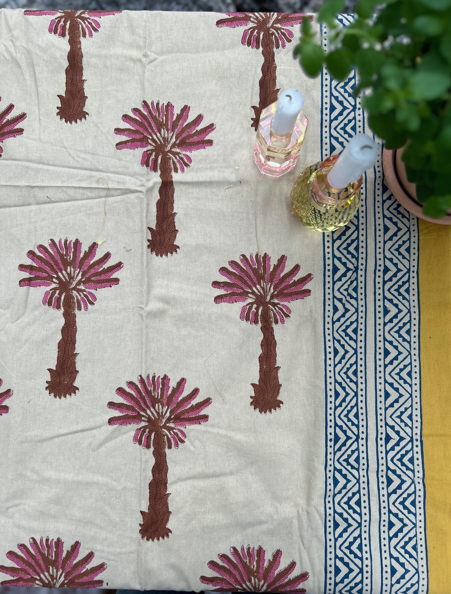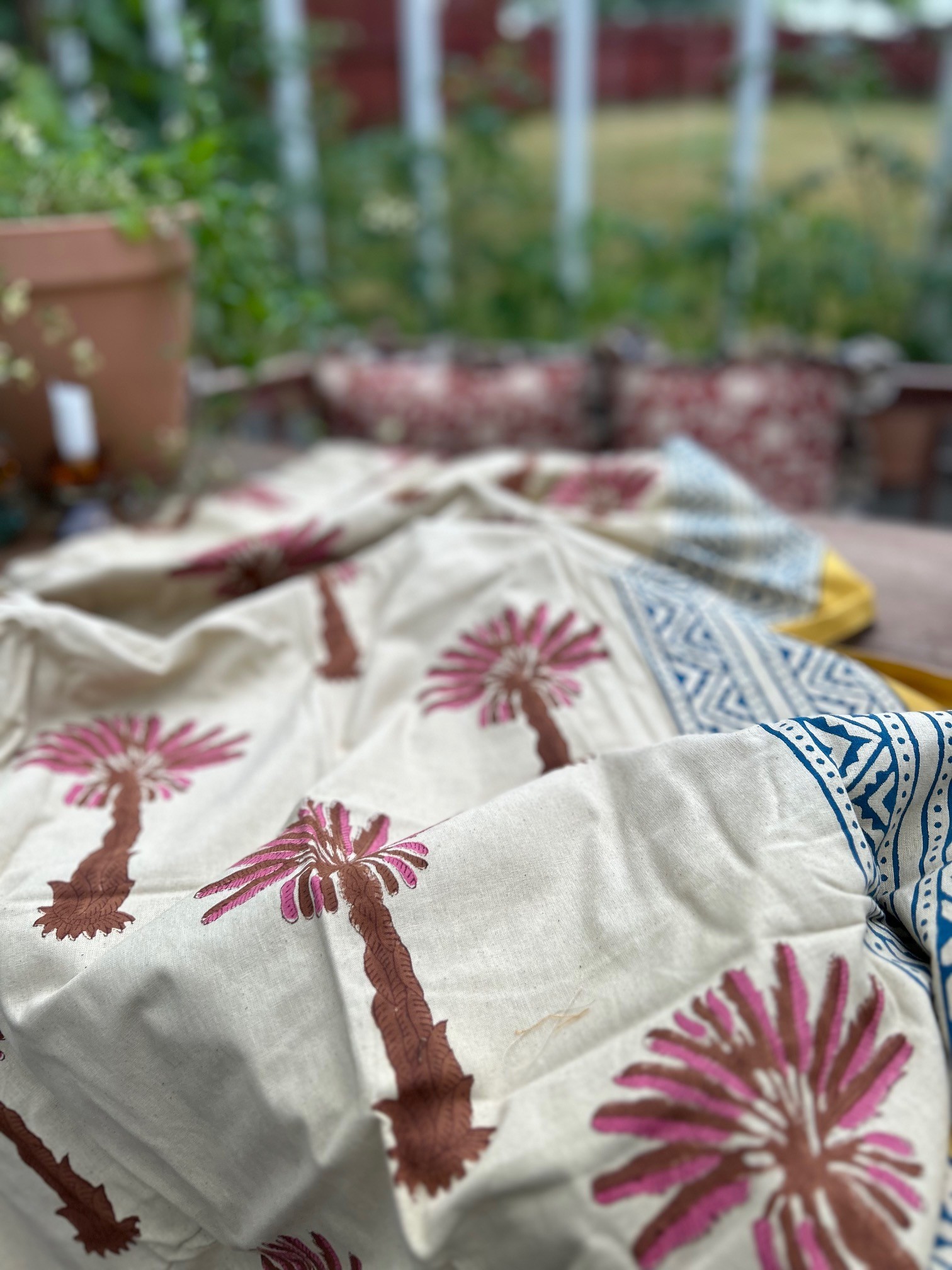 Tala Palmtree duk är tryckt för hand med snidade träblock och ack så mångsidig. Lägg den över din säng, soffa eller ha en picknick eller strandsession med denna skönhet. Den kommer i en matchande väska.