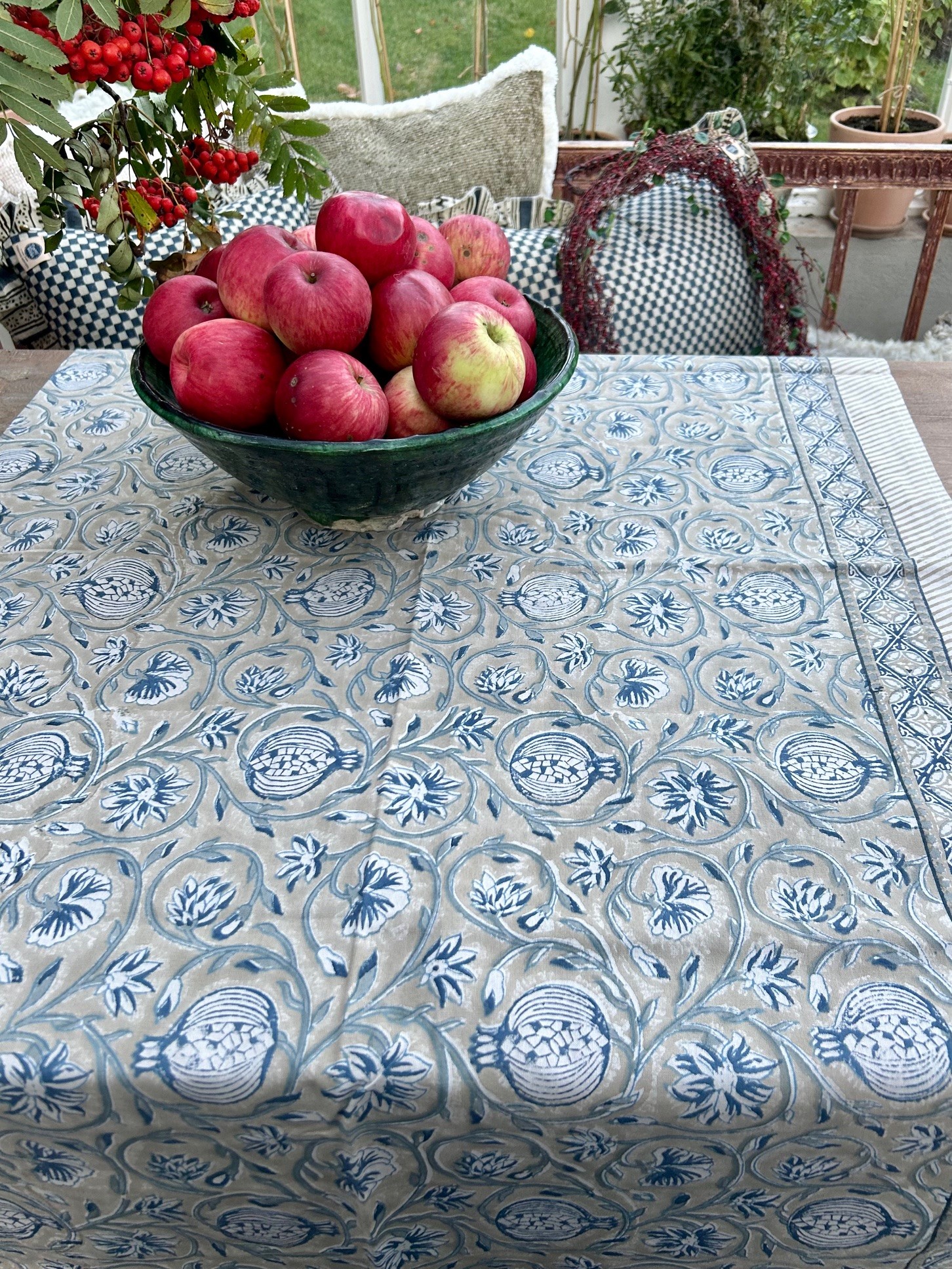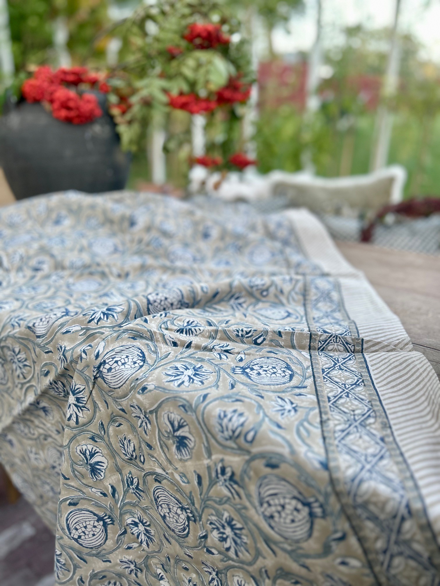 Duken är tillverkad av slitstark högkvalitativ bomull och handtryckt med den antika konsten att trycka träblock.