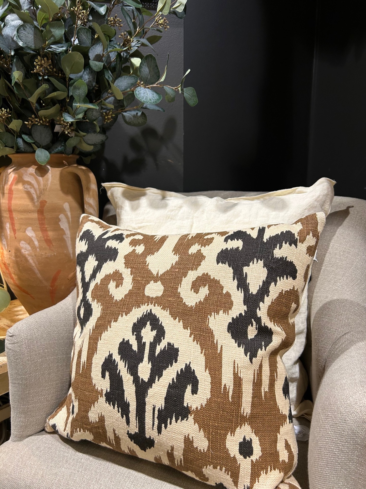 Adi är ett kuddfodral i linne med ett etniskt mönster i storlek 50 x 50 cm. Det dekorativa mönstret drar blickarna till sig och passar lika bra i soffan som ensam i fåtölj. Enfärgad baksida och innerkudde ingår ej.