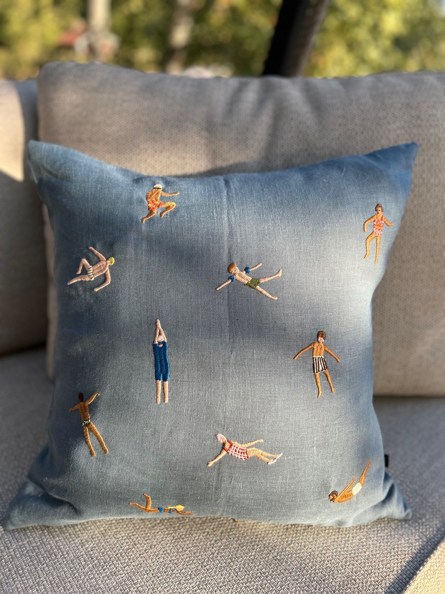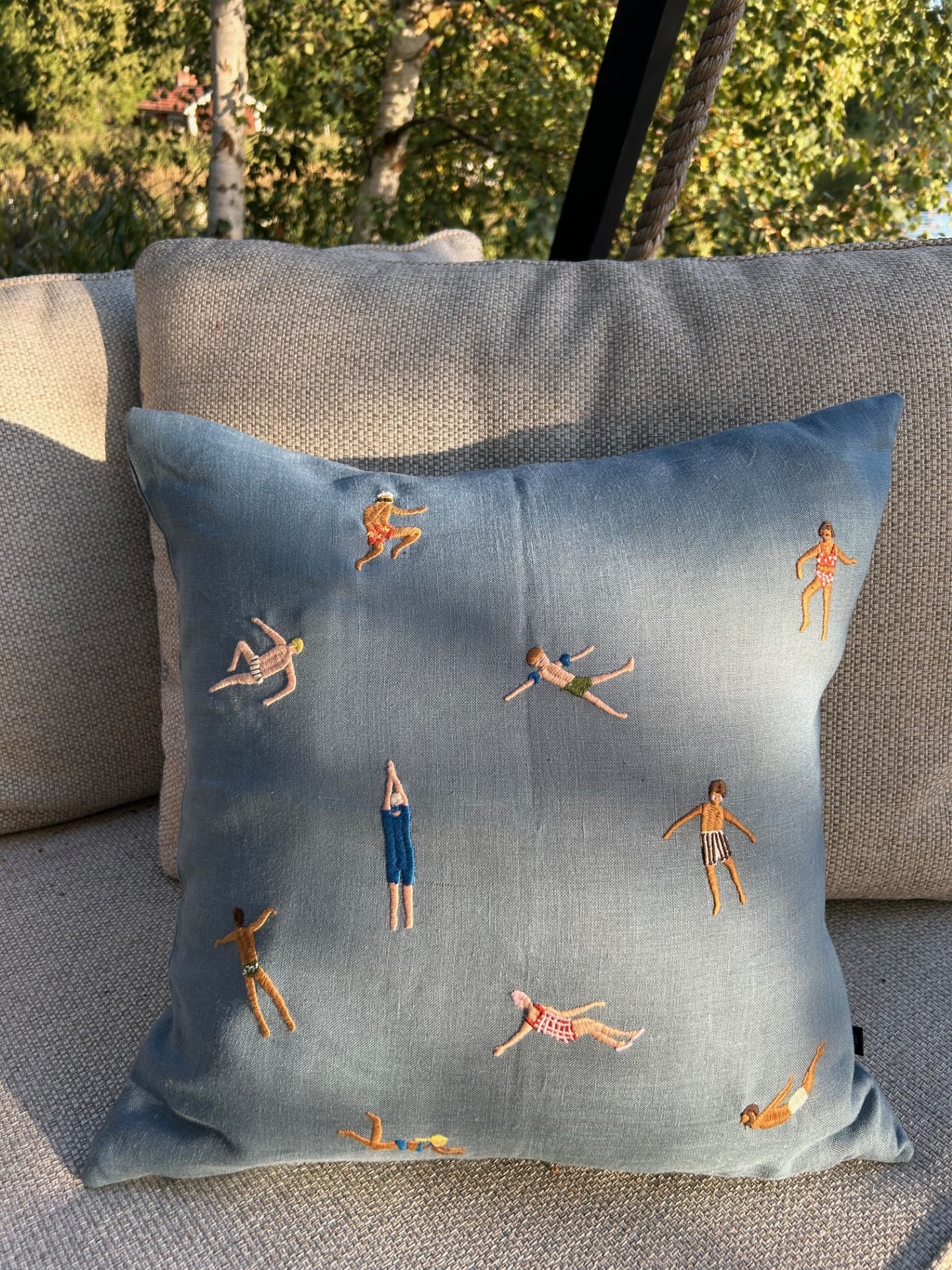 Oavsett väder vill vi hoppa i! Älskade Swimmers-motiv som broderat kuddfodral i en ny blå variant på ett kuddfodral i 100% linne. Detta blir garanterat en uttrycksfull inredningsdetalj i soffan eller på sängen.