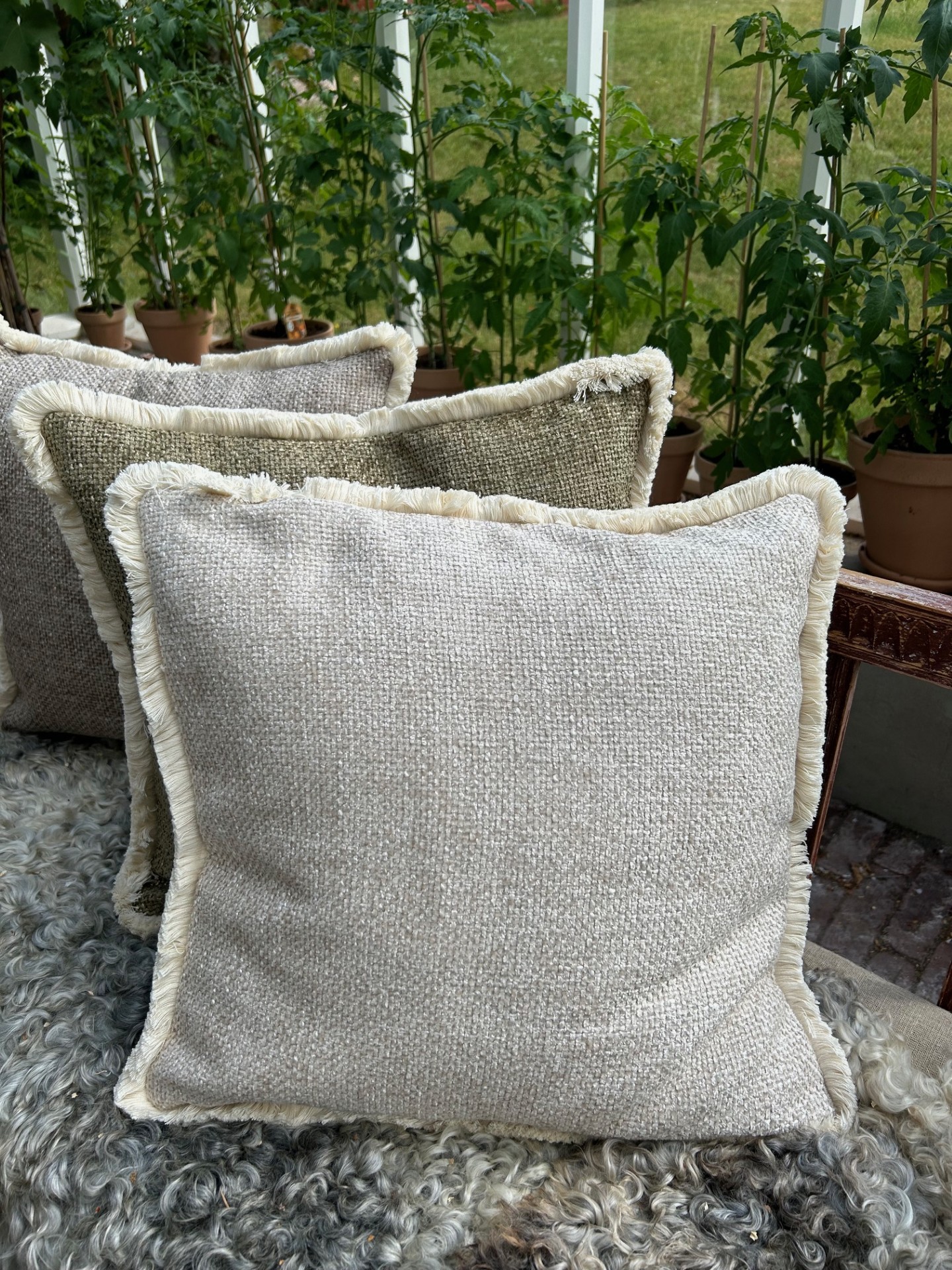 Kuddfodral med härlig mjuk, grov struktur med en franskant. Ett klassiskt sobert uttryck men ändå med lite karaktär då strukturen är levande.