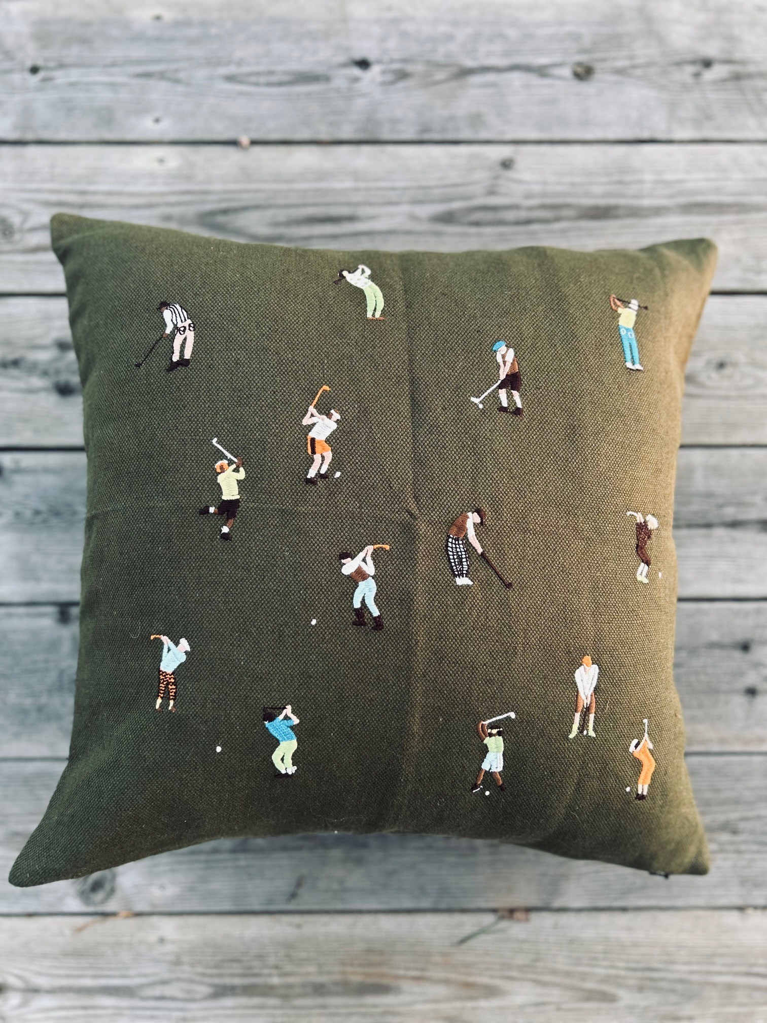 Lekfullt kuddfodral med broderade golfspelare på ena sidan, baksidan är enfärgat grön.